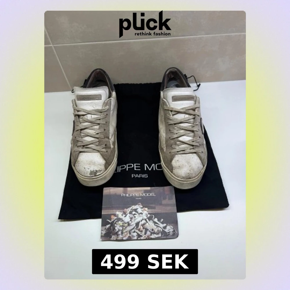 Snygga vita sneakers från Philippe Model Paris med beige och grå detaljer. Skorna har klassisk låg profil, rund tå och snörning. Tillverkade i skinn och mocka med kontrasterande hälparti i mörkgrå mocka. Perfekta för dig som gillar en stilren men avslappnad look.
