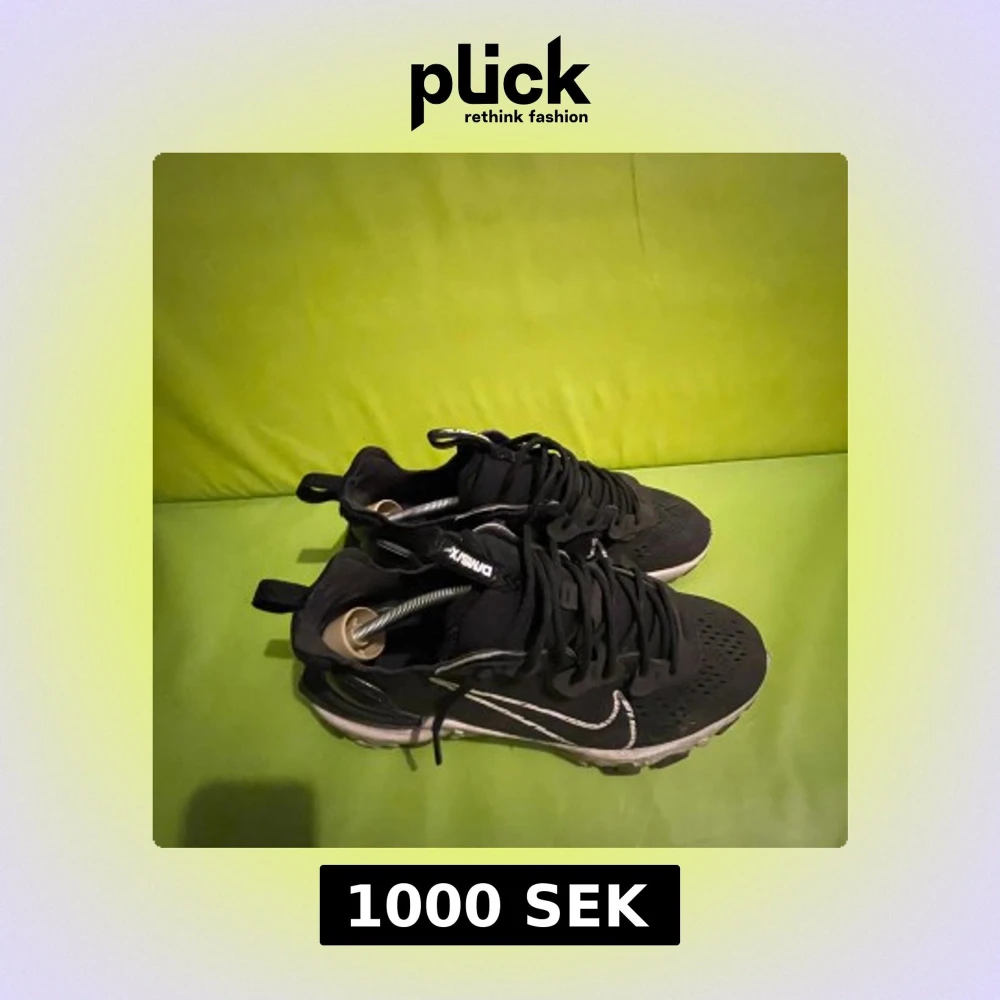 Svarta Nike sneakers med vit swoosh och snörning. Ovandelen är i ventilerande syntetmaterial och sulan har en unik design med synliga dämpningskuddar. Perfekt för dig som gillar sportig stil och vill ha bekväma skor med cool look.