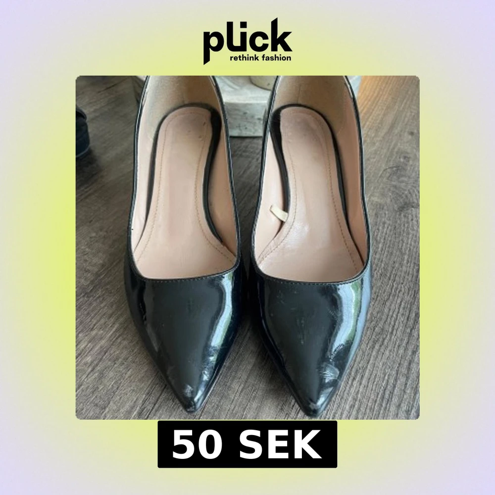 Klassiska svarta pumps i lack med spetsig tå och låg klack. Snyggt glansigt material och stilren design, perfekta för dig som gillar en elegant och tidlös look. Tillverkade i Italien och har en bekväm innersula i beige. Köpt på Plick för ett tag sen men kom aldrig till användning. Stl 37