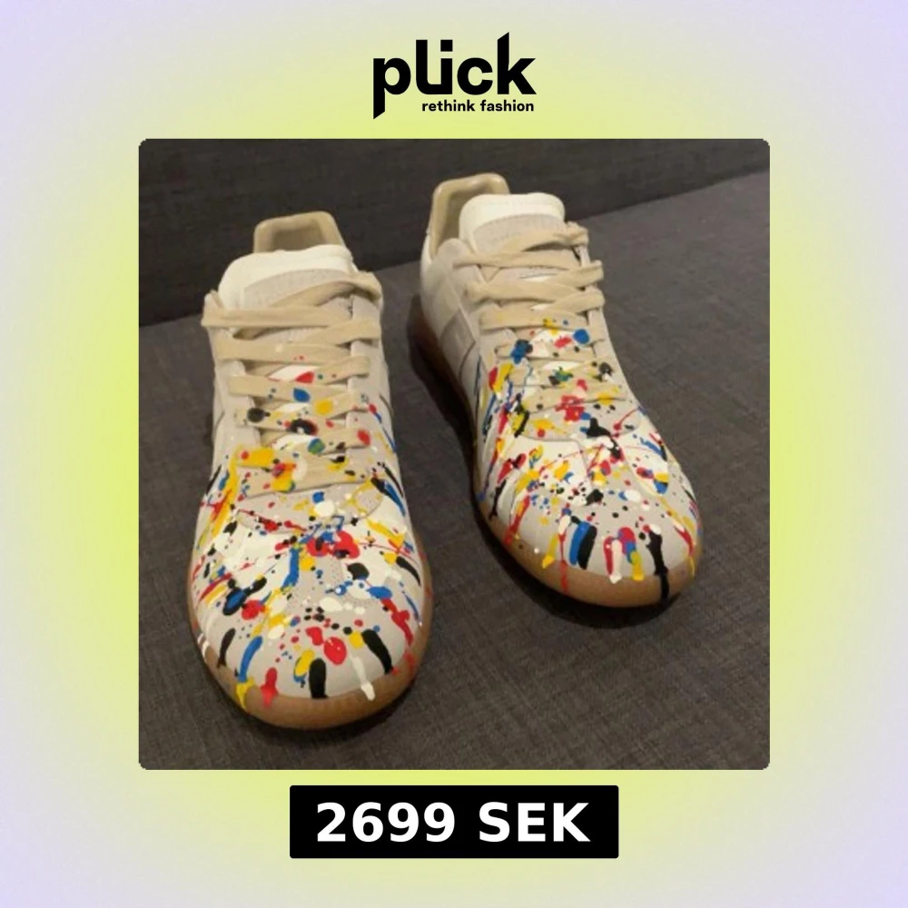 Unika vita sneakers från Maison margela med färgstänk i rött, blått, gult och svart. Skorna har beige snörning, gummisula och är tillverkade i skinn. Perfekt för dig som vill sticka ut med en kreativ och cool stil.