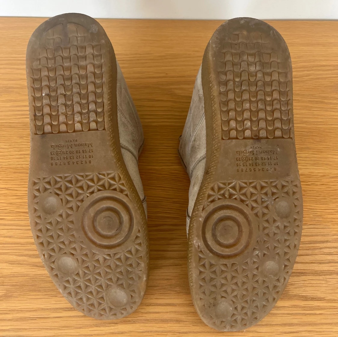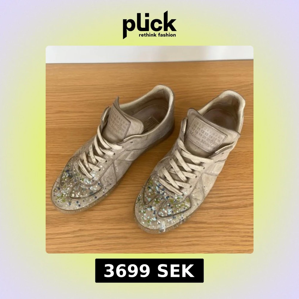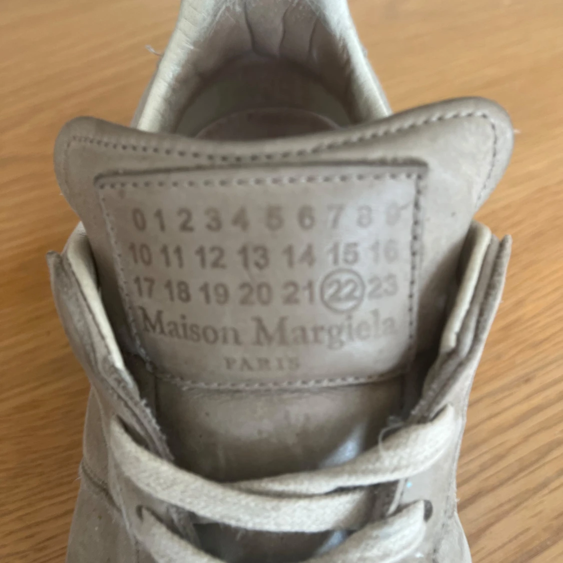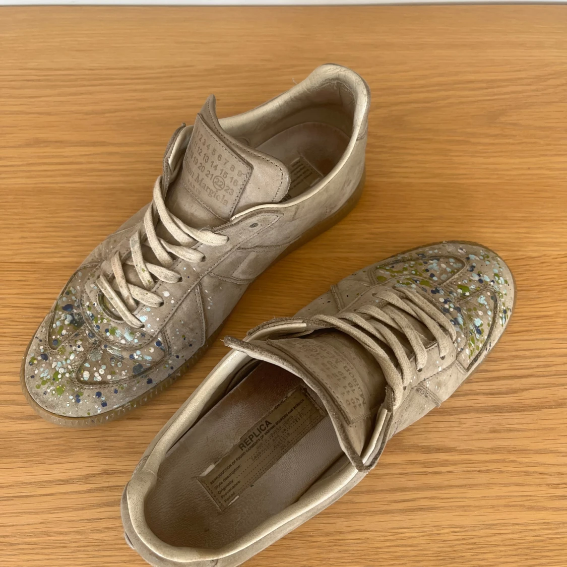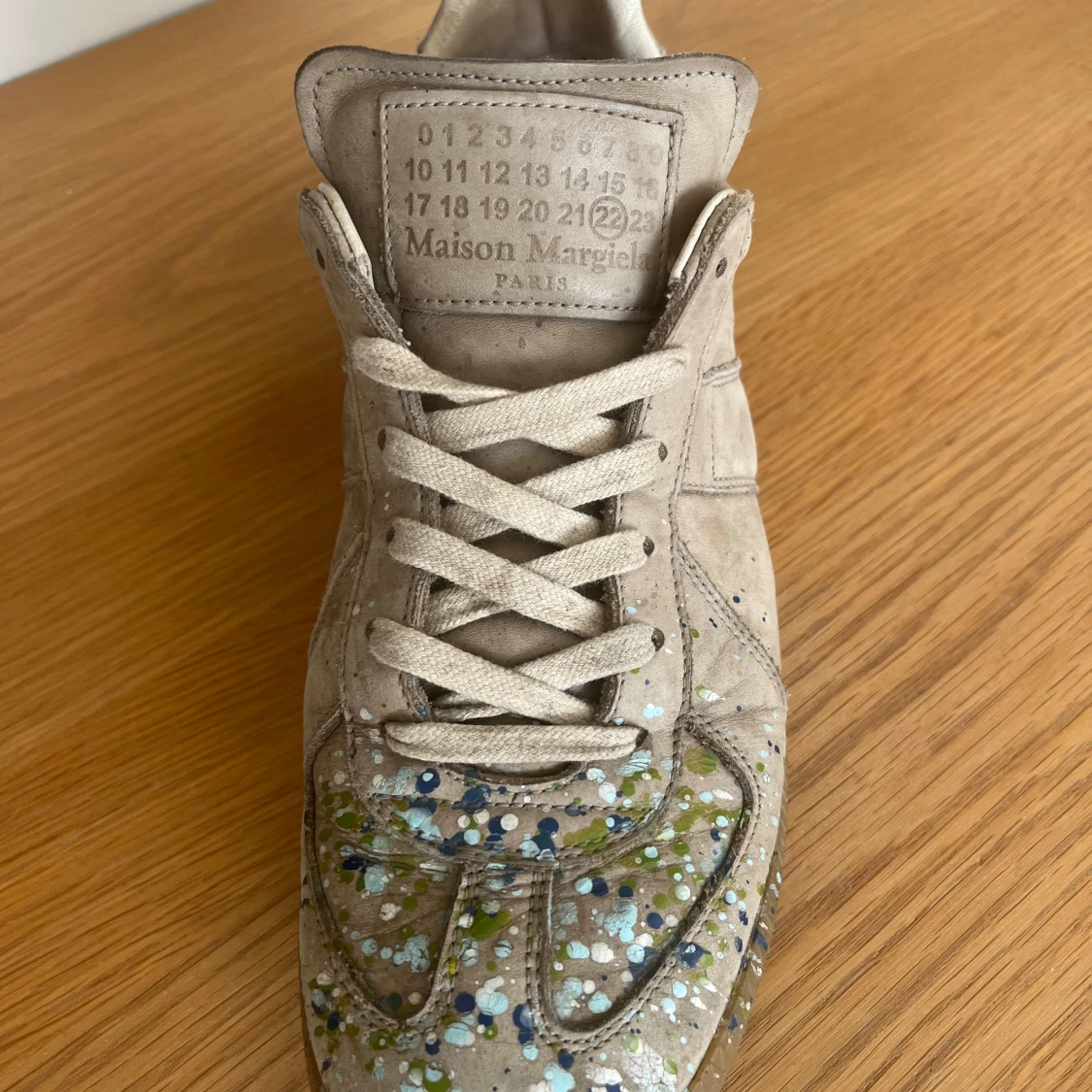 Maison Margiela sneakers i beige mocka med coola färgstänk i blått, grönt och vitt över tån. Klassisk rund tå, snörning och platt sula. Märkets ikoniska etikett på plösen. Perfekt för dig som gillar unik design och streetstyle.