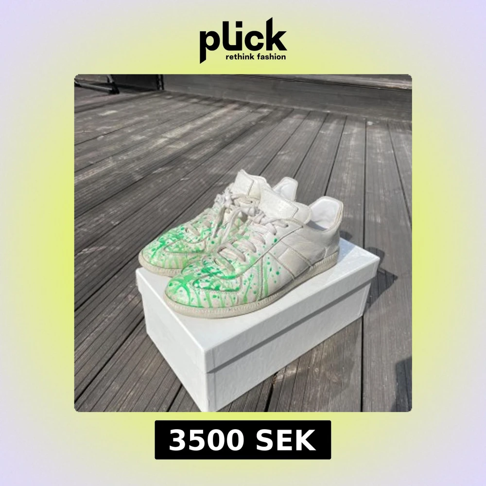 Unika sneakers från Maison Margiela i vitt skinn med coola gröna färgstänk. De har en klassisk snörning och en bekväm passform. Perfekta för dig som vill sticka ut med en konstnärlig touch på dina skor. Använda men i bra skick, redo för nya äventyr!