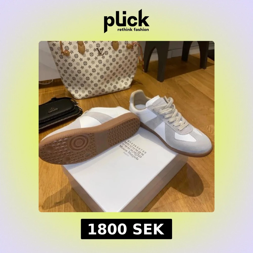 Maison Margiela sneakers i vitt och ljusgrått med beige snörning och gummisula. Klassisk rund tå och platt sula, tillverkade i skinn och mocka. Snygg minimalistisk design som passar perfekt till jeans eller dressade outfits.