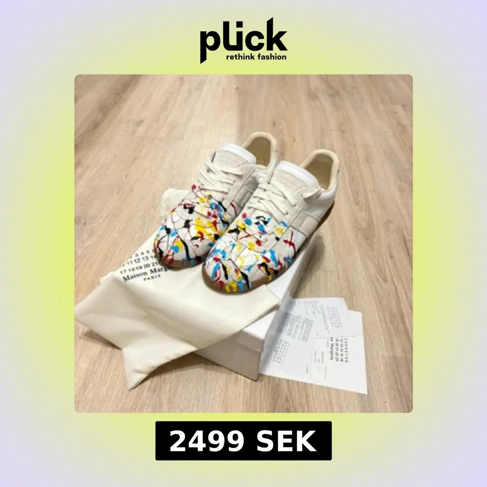 Unika vita sneakers från Maison Margiela med färgstänk i blått, gult, rött och svart. Skorna har klassisk låg siluett, snörning och bruna gummisulor. Tillverkade i skinn och textil för en lyxig känsla och cool konstnärlig vibe.