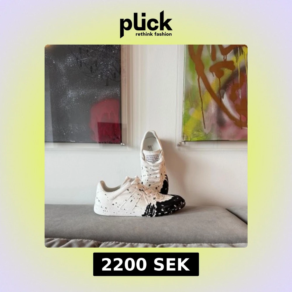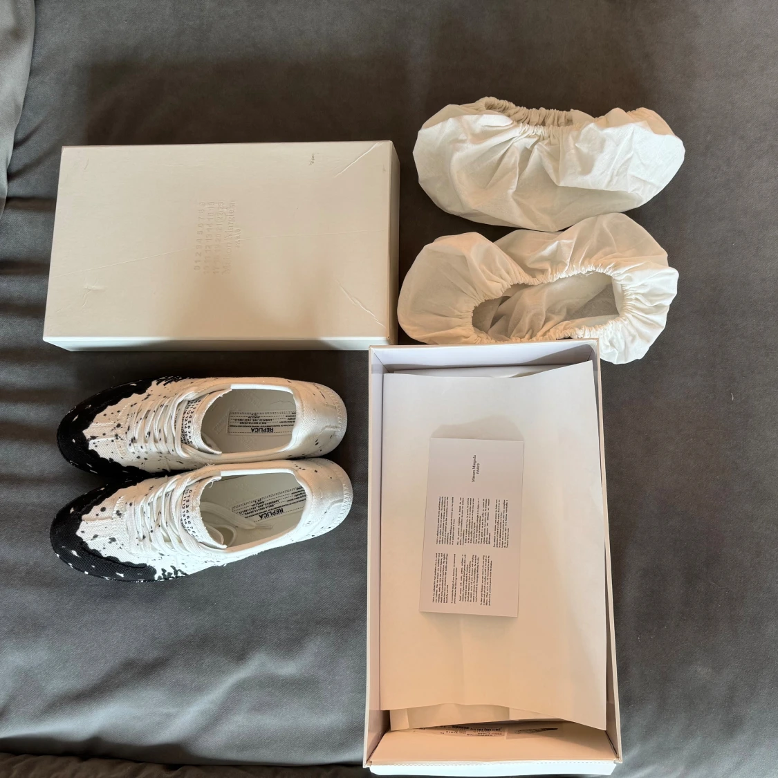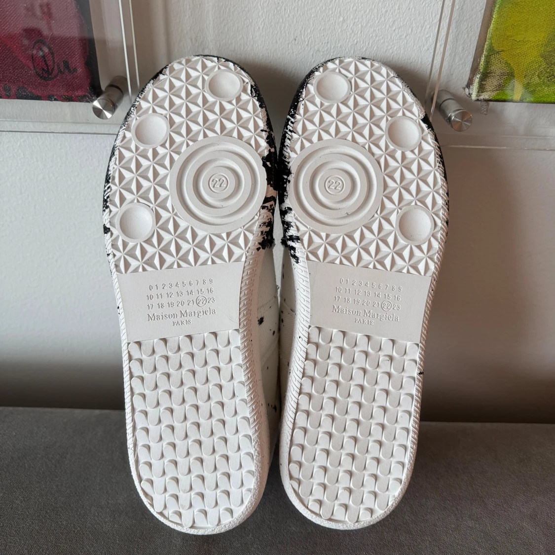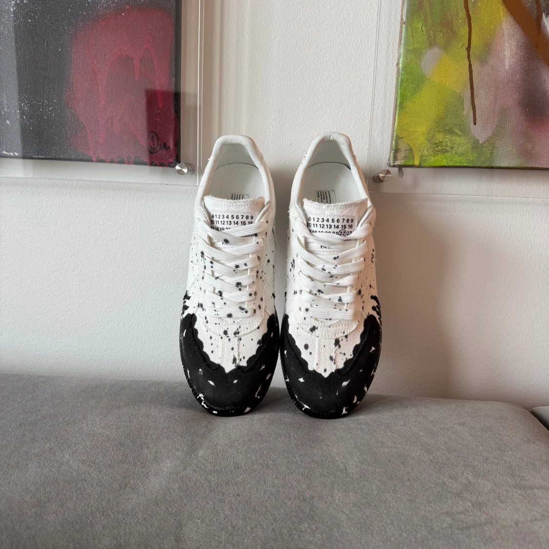 Maison Margiela skori i vitt med svart färgstänk-design. Klassisk låg modell med rund tå, snörning och platt sula. Skorna har en unik konstnärlig look och är tillverkade i skinn med textildetaljer. Kommer med originalkartong och dustbags.