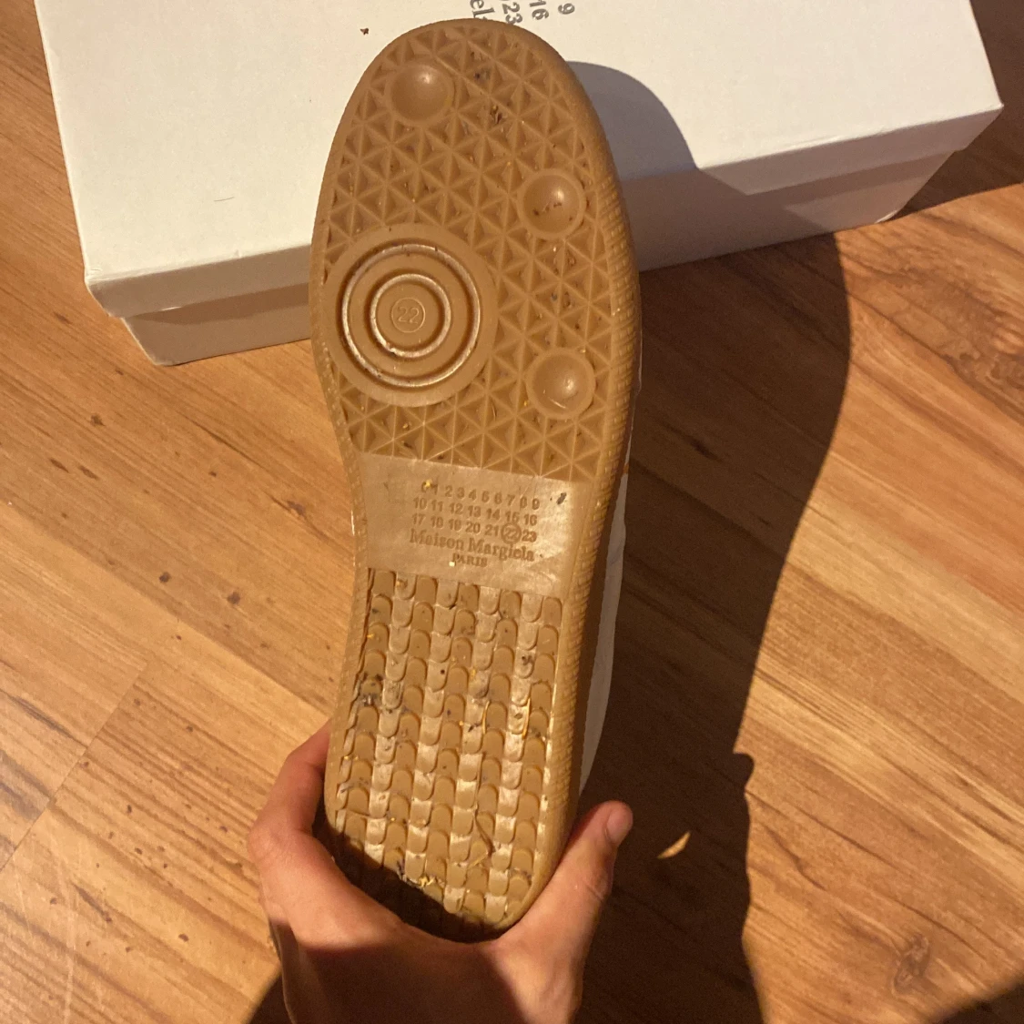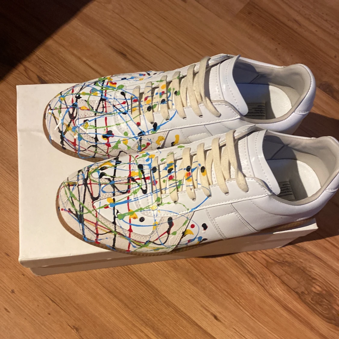 Unika vita sneakers från Maison Margiela med färgstänk i blått, rött, gult, grönt och svart. Skorna har klassisk låg siluett, snörning och gummisula. Tillverkade i skinn och har en konstnärlig vibe som sticker ut i mängden.