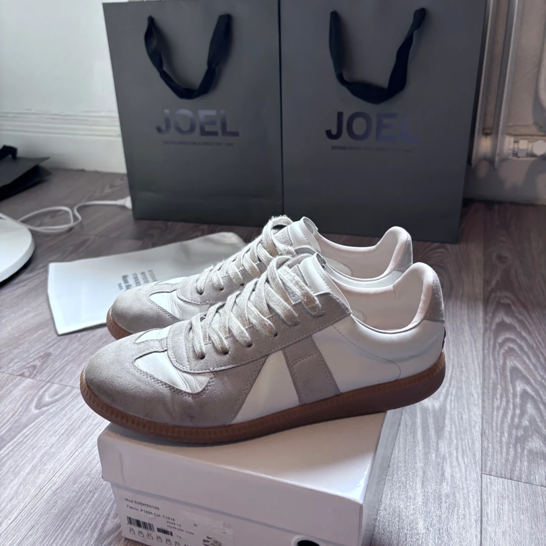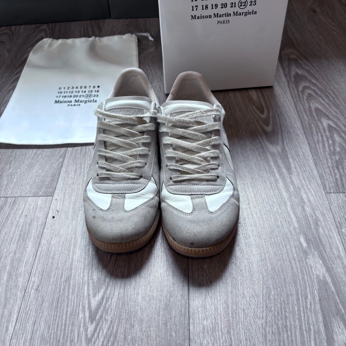Säljer ett par klassiska Maison Margiela sneakers med vit och ljusgrå ovandel i skinn och mocka. Skorna har snörning och en brun gummisula som ger en clean och stilren vibe. Perfekta för dig som gillar minimalistisk design och premiumkänsla.