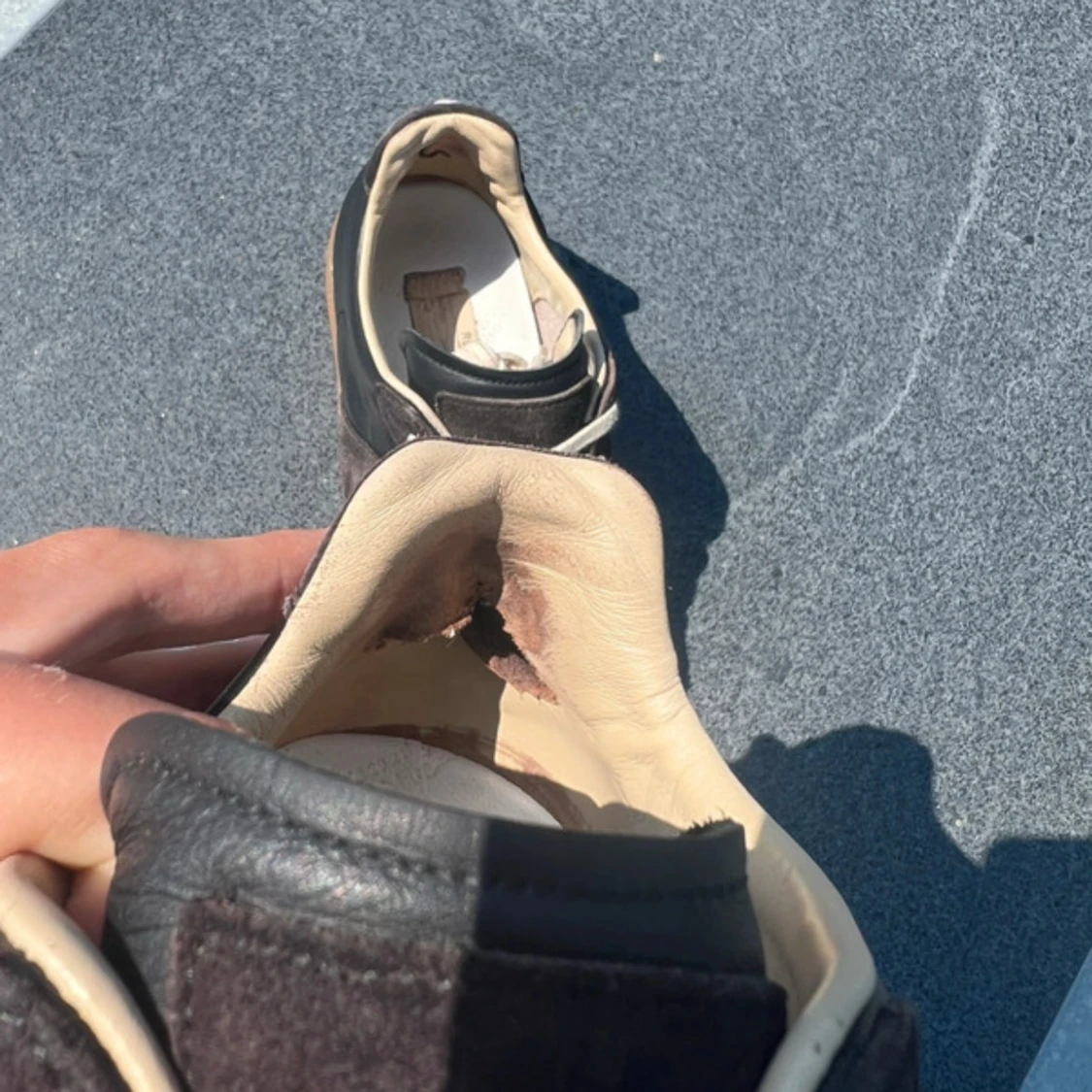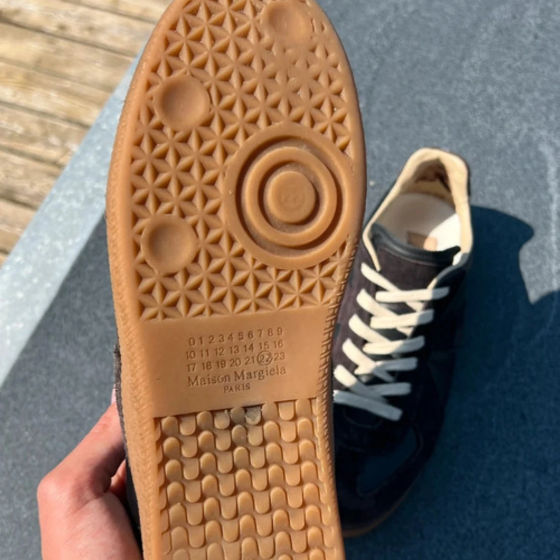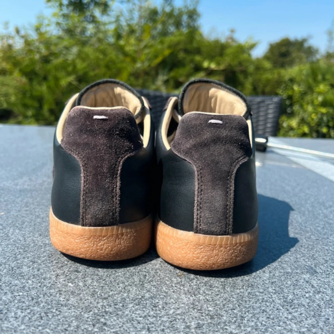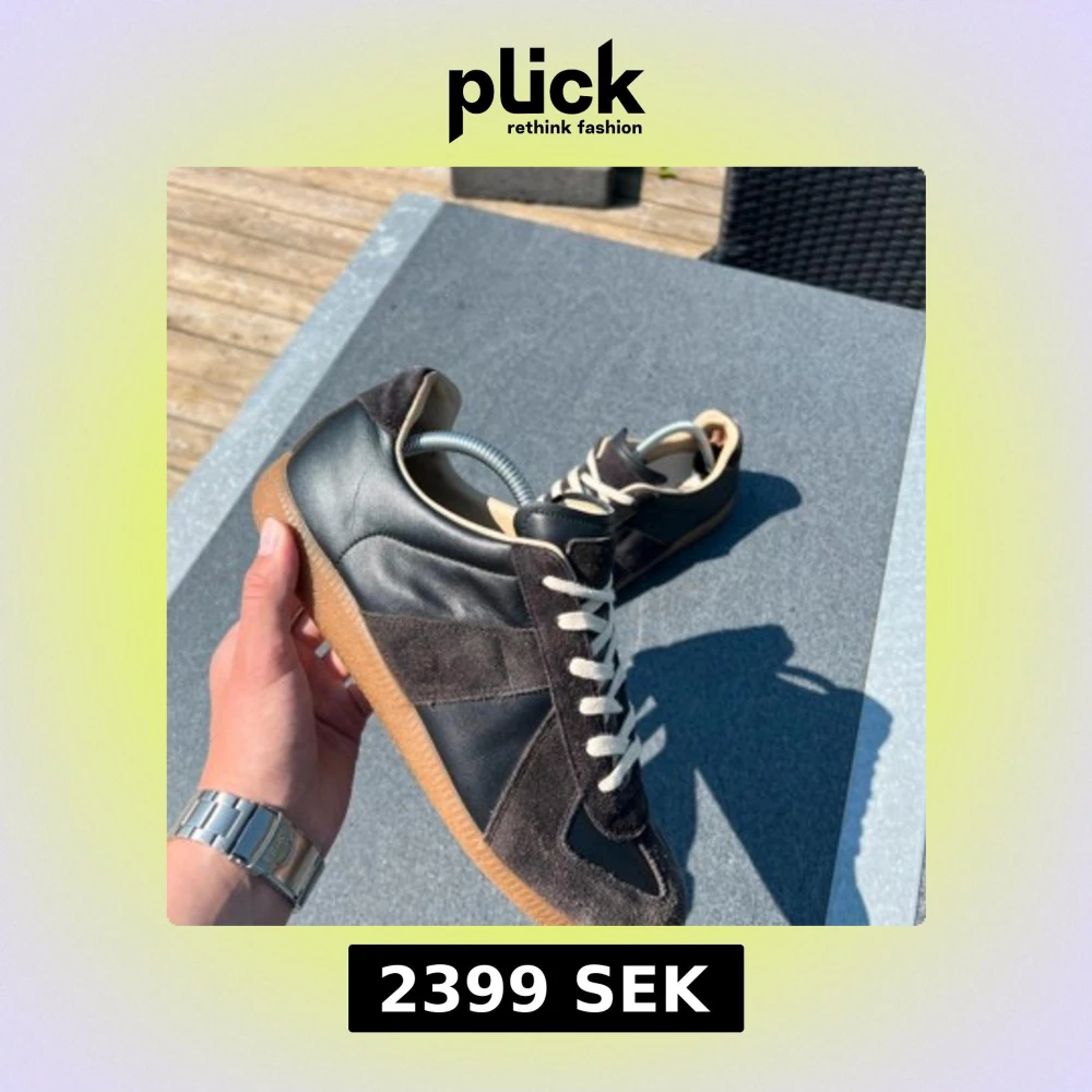 Maison Margiela sneakers i svart skinn och mocka med beige detaljer och klassisk gummisula. Snygg retrostil med vita snören och rund tå. Perfekta för dig som gillar stilrena och tidlösa sneakers med lyxig känsla. Skriv om du undrar något !
