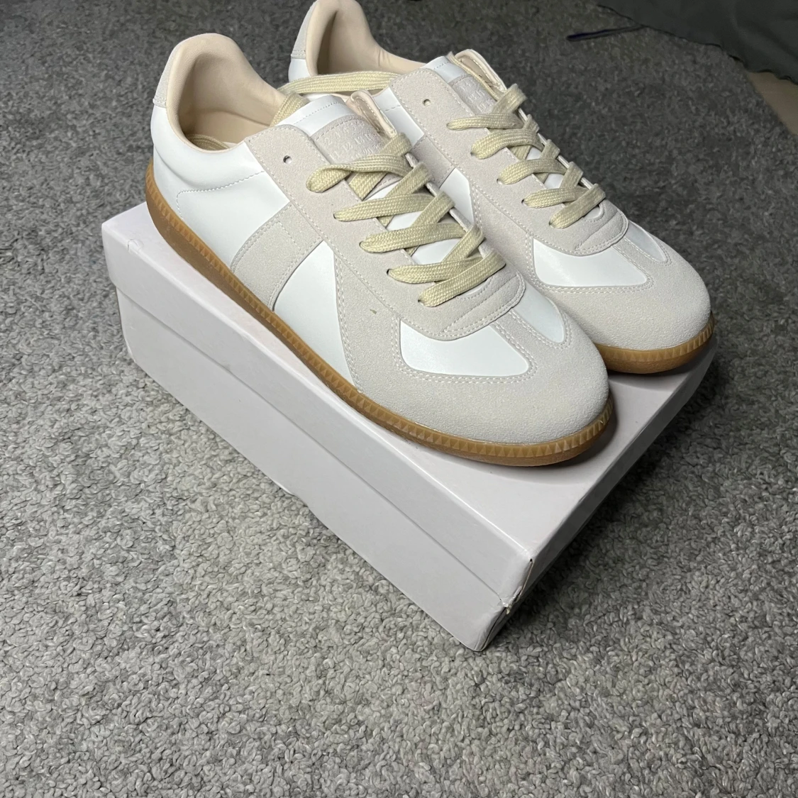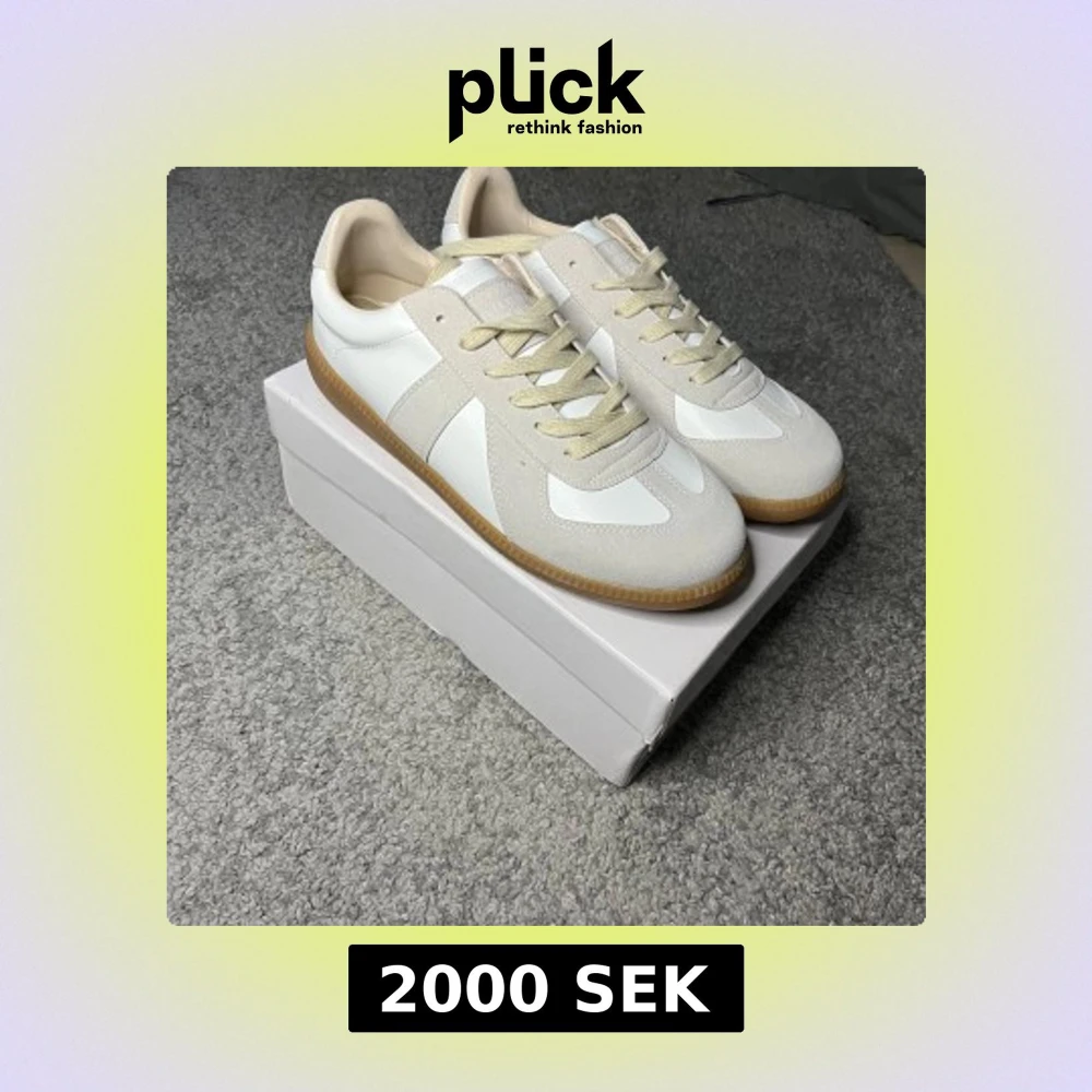 Maison Margiela GATs – 43 👟 Stilrena och tidlösa sneakers från Maison Margiela – perfekt för både vardag och uppklätt. Vit/kräm i läder och mocka med klassisk gummisula. • Storlek: EU 43 • Skick: Nyskick, endast testade inomhus • Nypris: ca 5000 kr • Medföljer: Originalkartong + dustbag. Osäker på äkthet…. 💡 Köpta via Plick. Tidigare ägare uppgav att de är äkta och visade kvitto, men jag kan inte garantera äktheten – därav det låga priset.