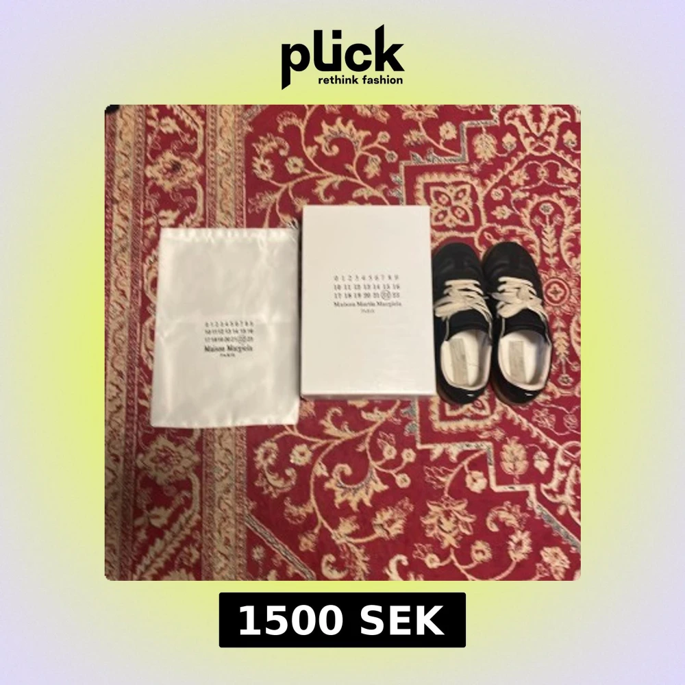 Maison Margiela sneakers i svart skinn och mocka med vita snören och beige sula. Klassisk och stilren modell med rund tå och platt sula. Kommer med originalbox och dustbag. Perfekta för dig som gillar minimalistisk och lyxig streetstyle.