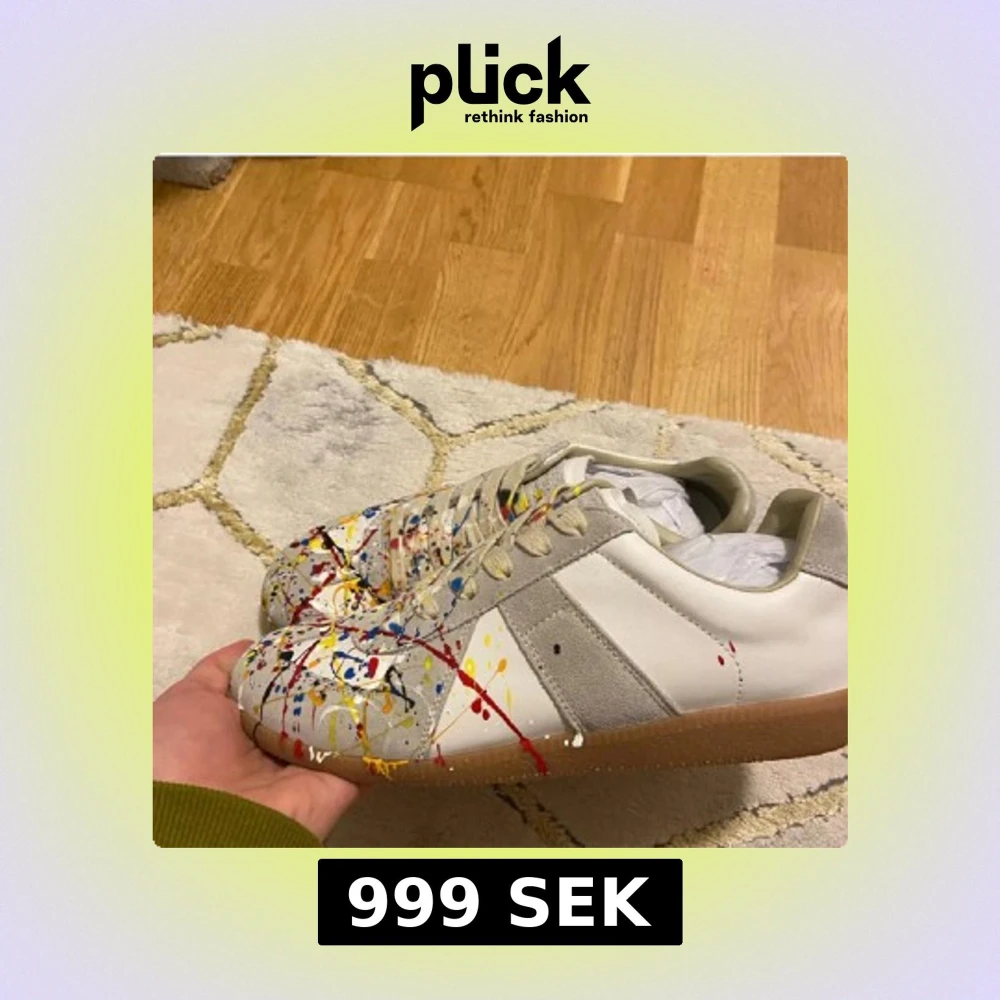 Maison Margiela i vitt och grått skinn och mocka, med unika färgstänk i rött, blått, gult och svart. Klassisk låg modell med snörning och gummisula. Perfekt för dig som vill sticka ut med en konstnärlig vibe.