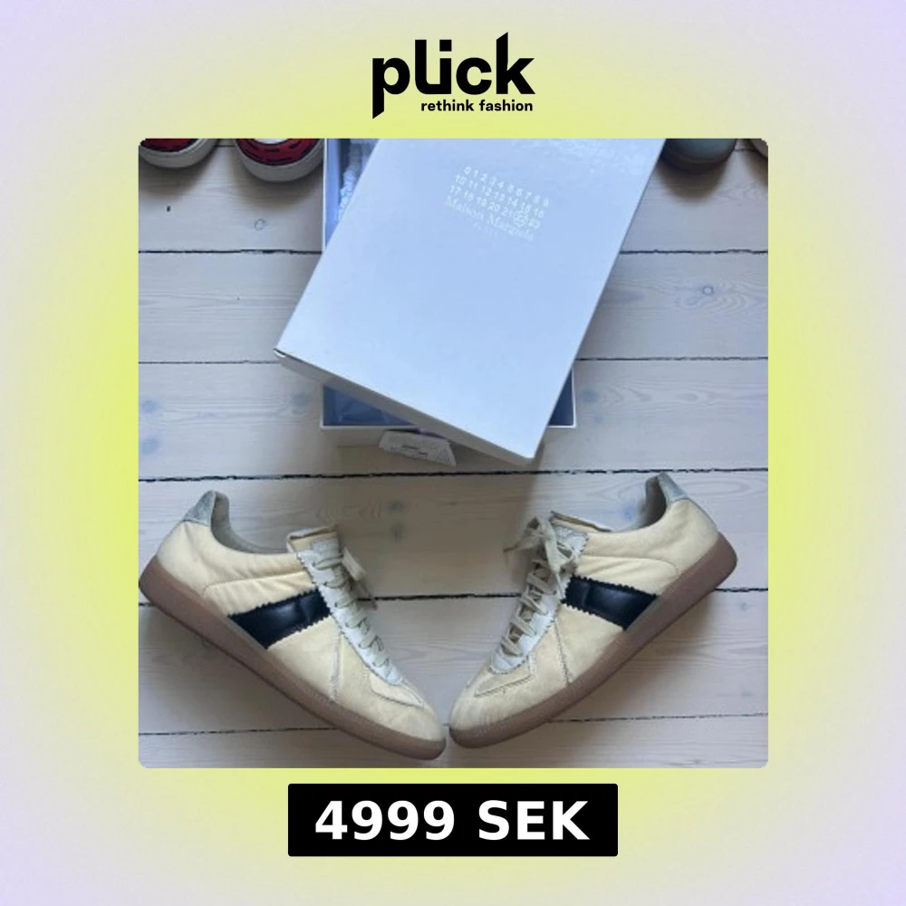 Unika sneakers från Maison Margiela i beige canvas med vita och svarta detaljer samt bruna gummisulor. Skorna har snörning, rund tå och en cool kontrast med svart sidopanel. Perfekta för dig som gillar stilrena men ändå edgy sneakers.