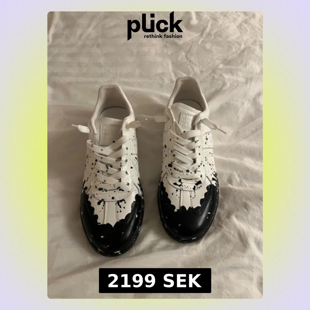 Unika sneakers i vitt och svart med coolt färgstänksmönster. Skorna har rund tå, snörning och platt sula. Tillverkade i skinn och levereras med skyddspåsar och originalkartong. Perfekta för dig som vill sticka ut med din stil.