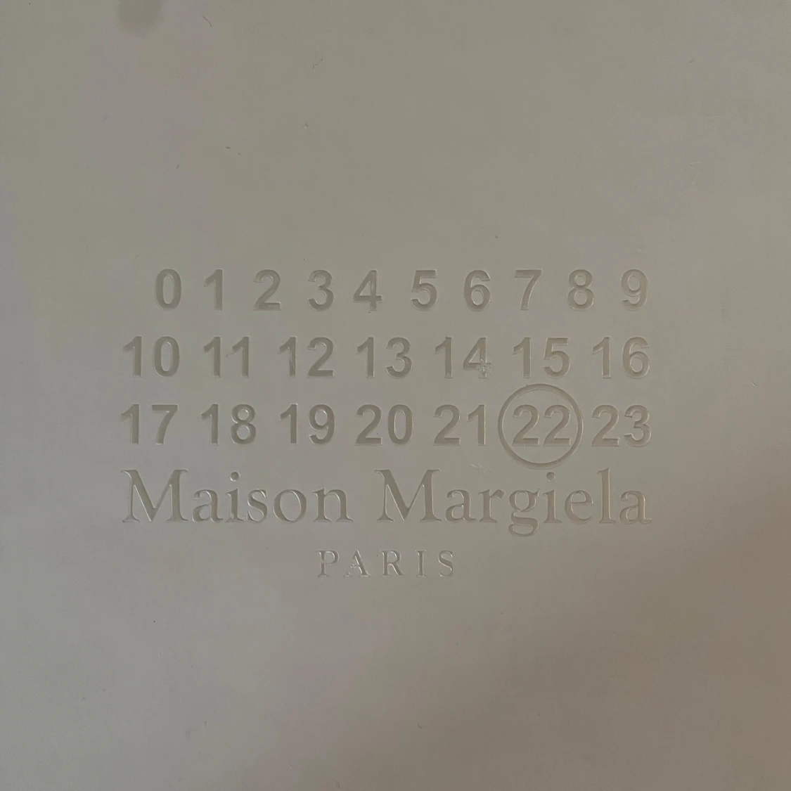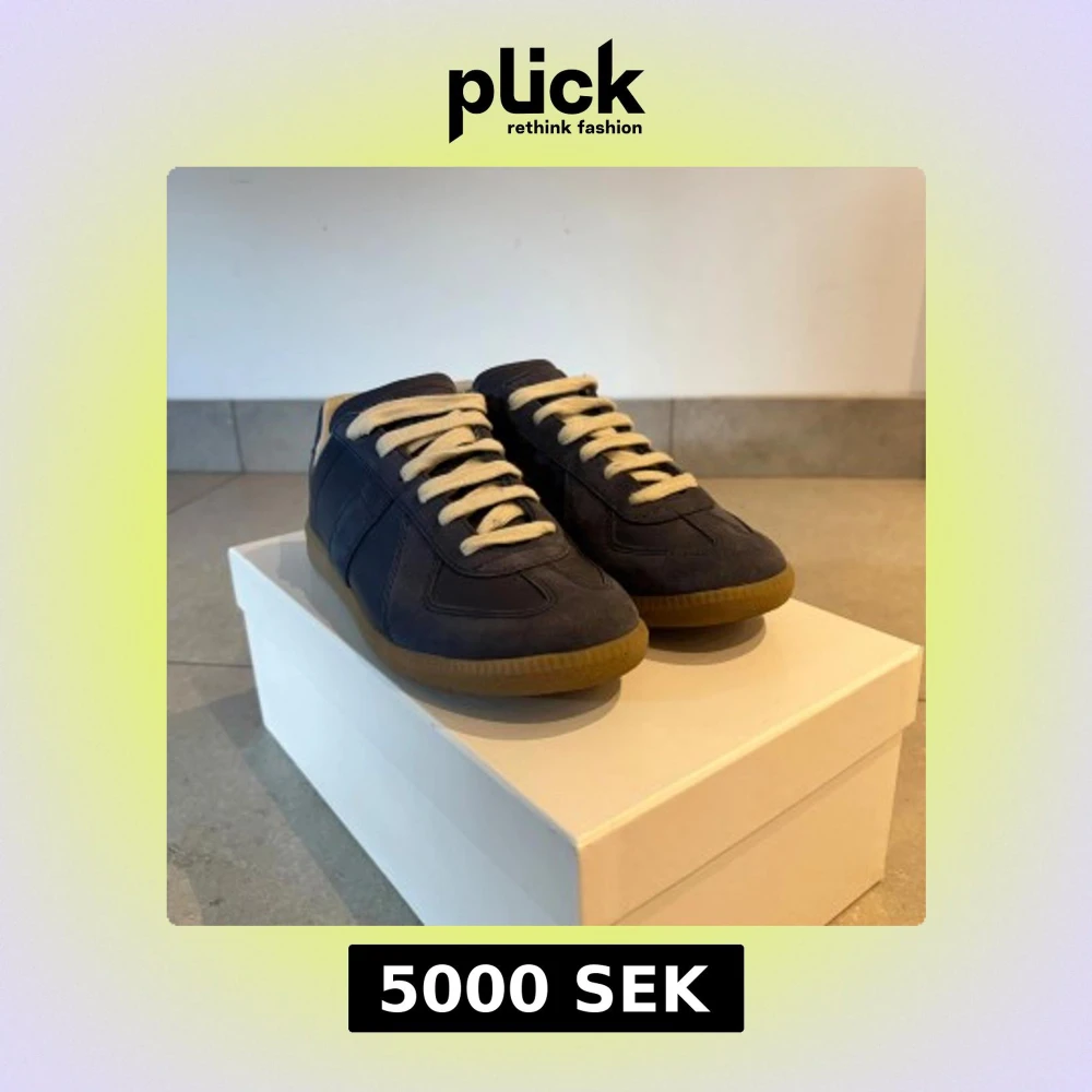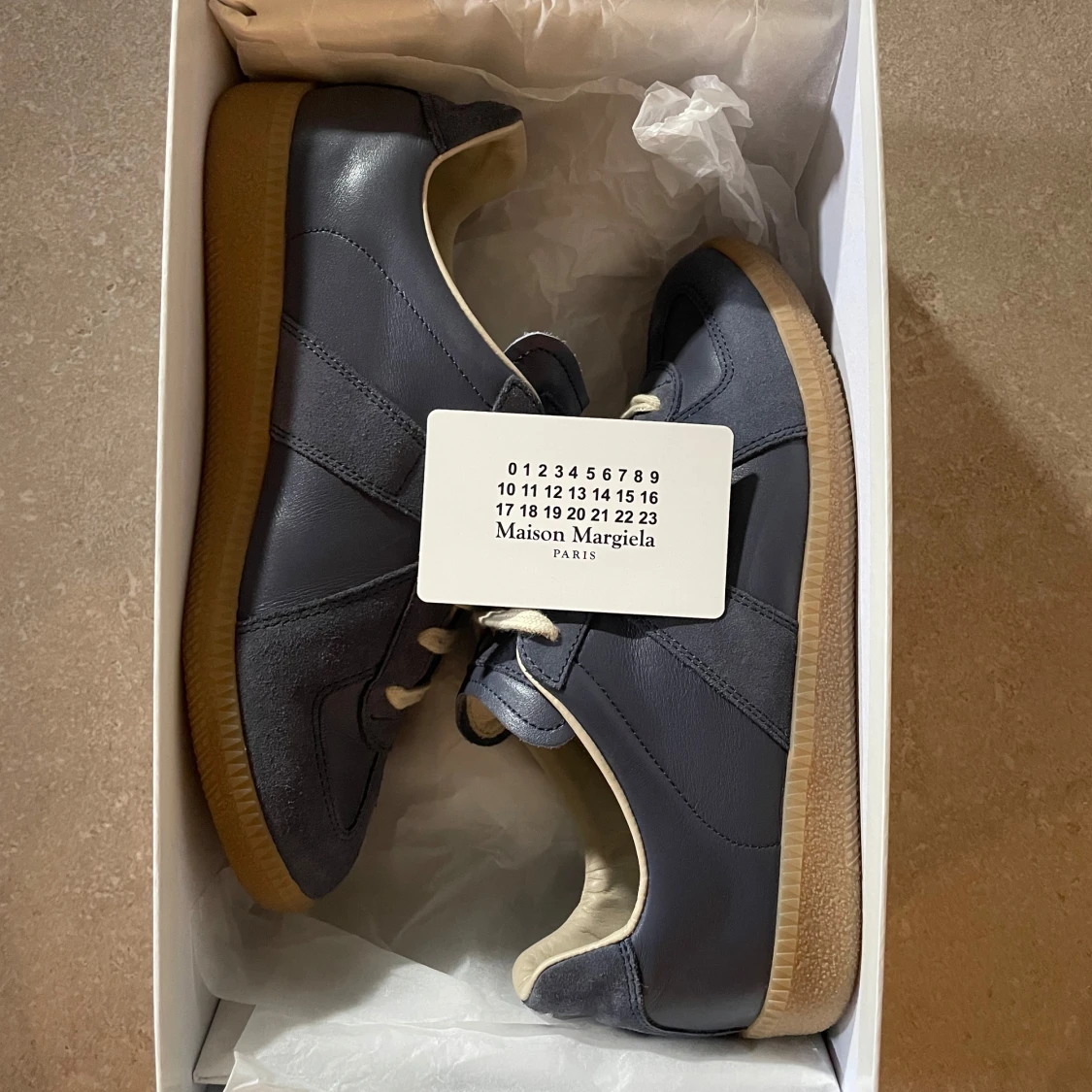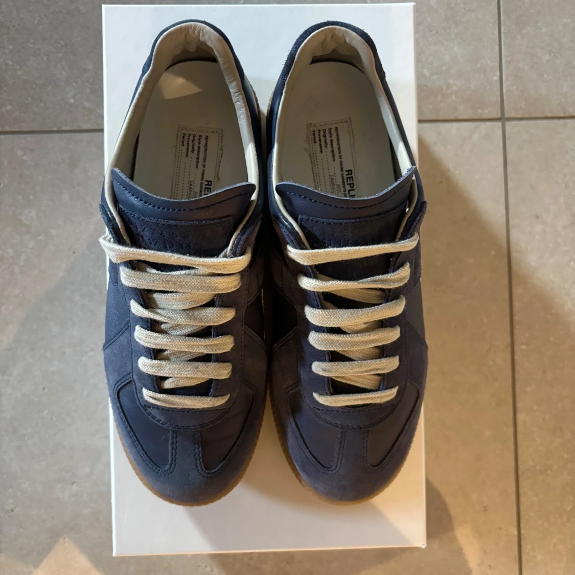 Maison Margiela sneakers i marinblått skinn och mocka med beige snörning och gummisula. Klassisk rund tå och platt sula, inspirerad av retro trainers. Snygg kontrast mellan mörkblå ovandel och ljusare detaljer. Perfekt för dig som gillar stilrena och tidlösa sneakers. Skriv om du har frågor!