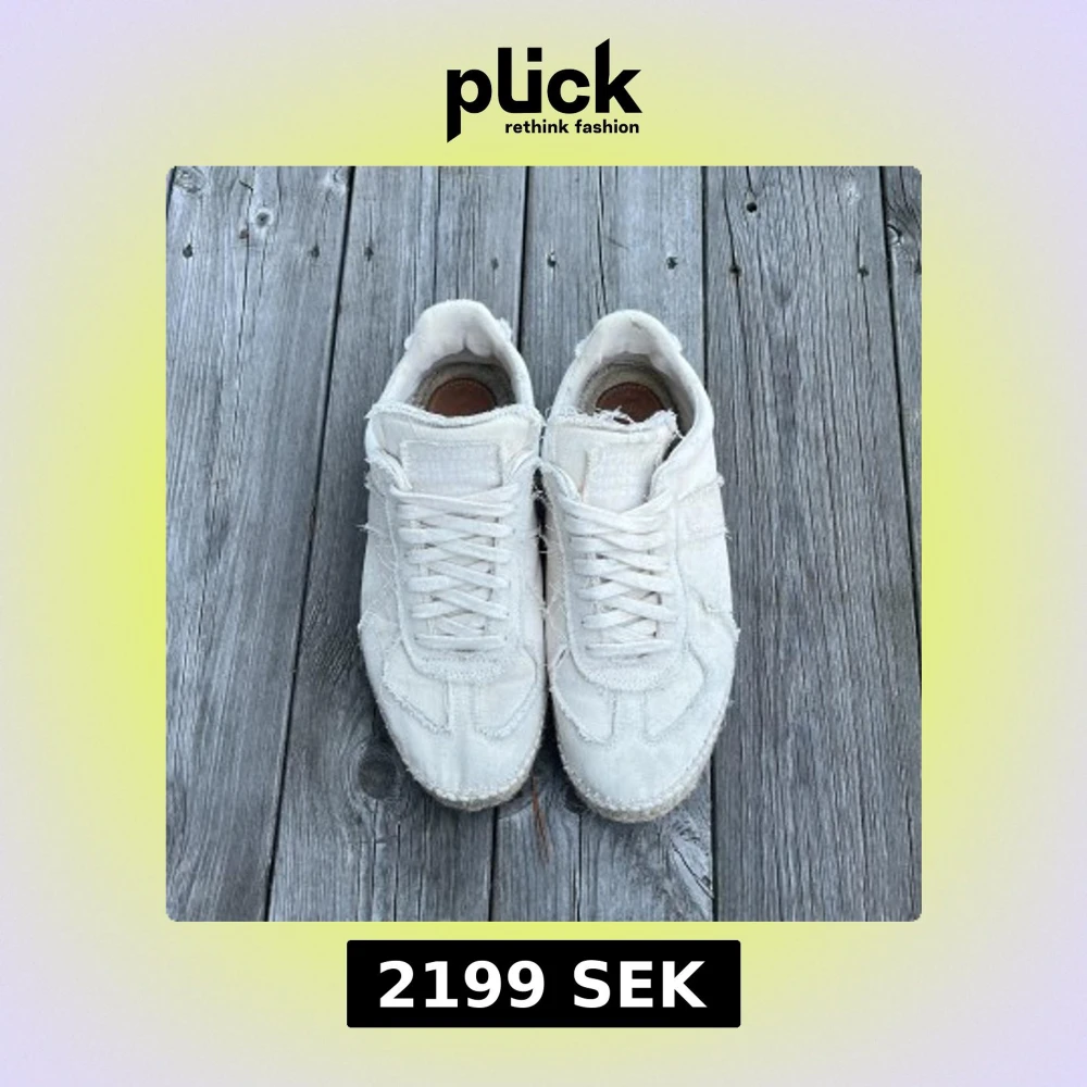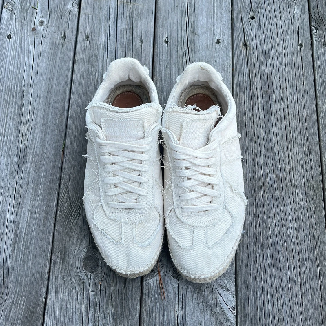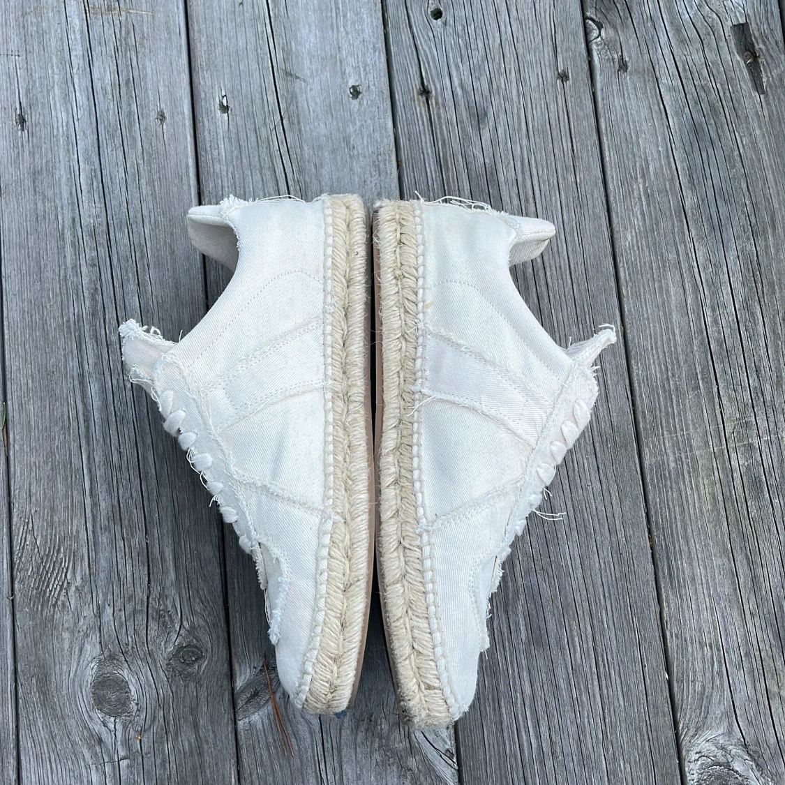 Säljer ett par vita sneakers med fransiga kanter och snörning. Skorna har en unik espadrille-inspirerad sula med grov söm runt om. Tillverkade i bomullstyg med platt sula och rund tå. Perfekta för dig som gillar en chill och avslappnad stil.