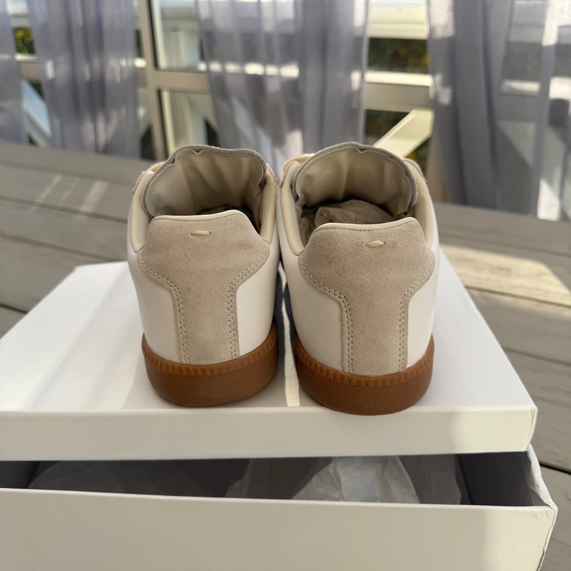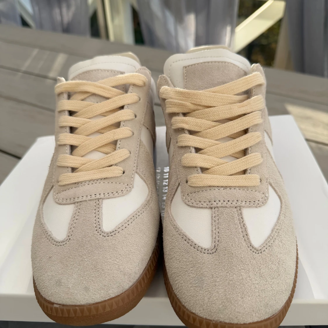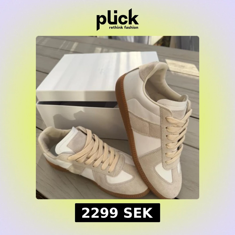 Maison Margiela sneakers i vitt och beige med snygga detaljer i mocka och skinn. Skorna har platt gummisula i brunt, rund tå och klassisk snörning. Perfekt för dig som gillar minimalistisk och clean stil. Kommer med originalkartong. Storlek 43
