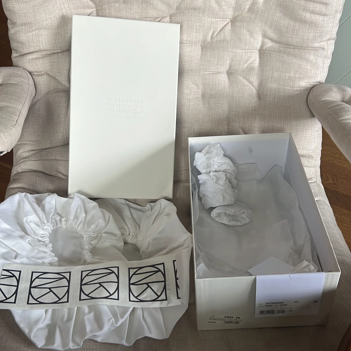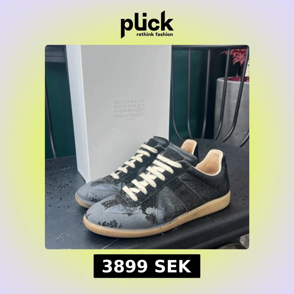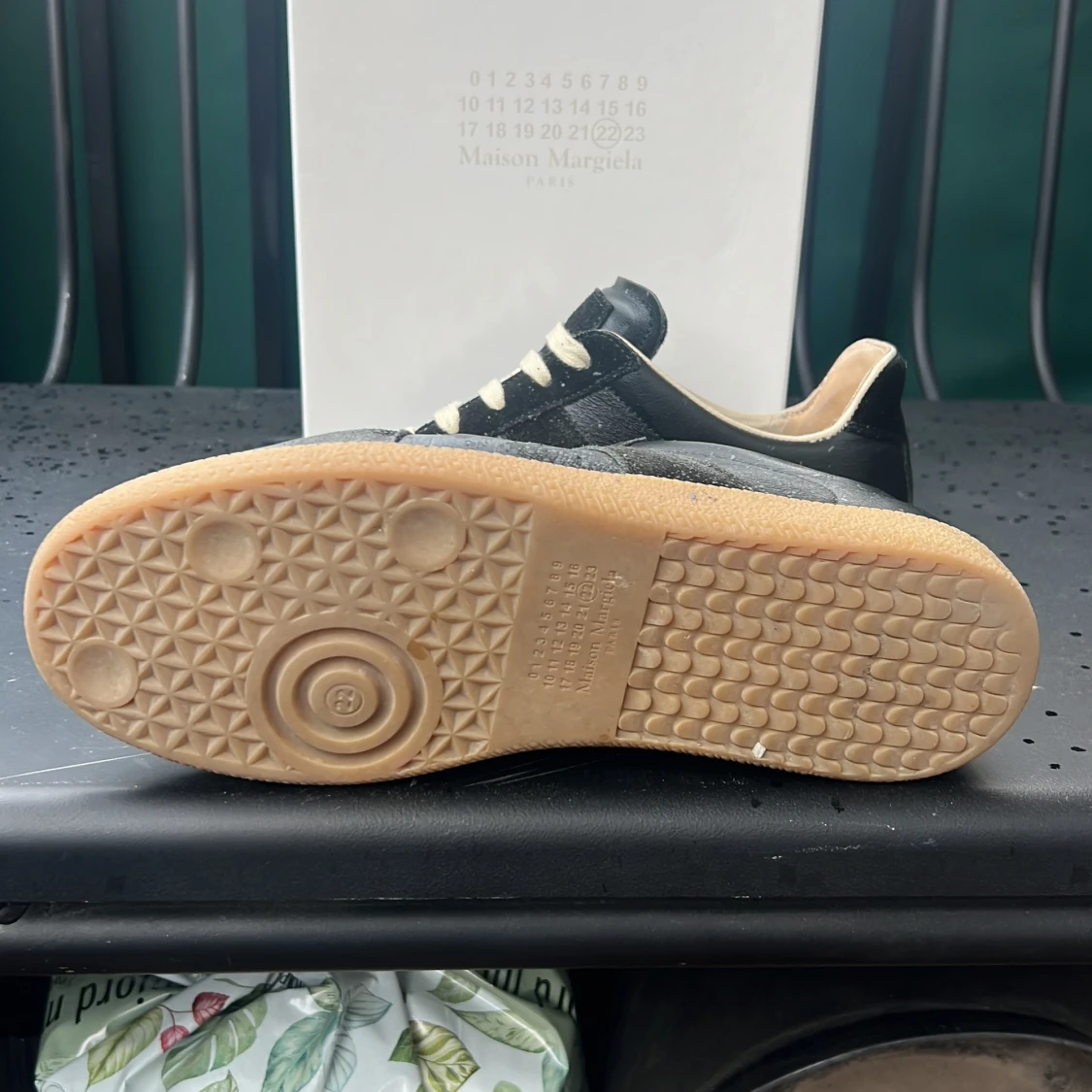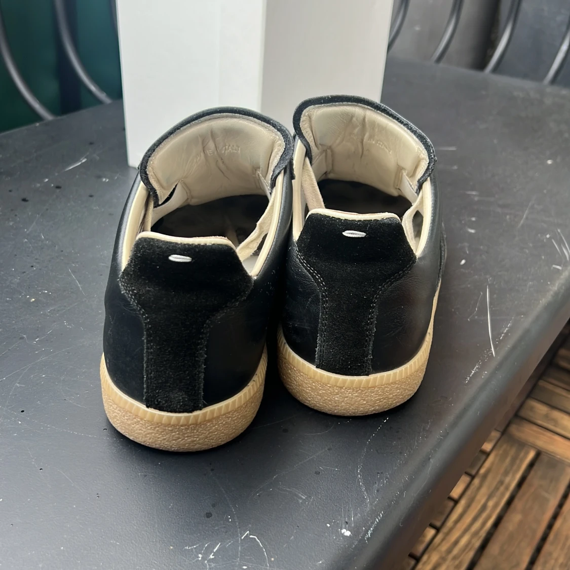 Maison Margiela sneakers i svart skinn med beige sula och vita snören. Klassisk låg modell med rund tå och platt sula. Lämnat in till skomakare för att sy på mocka vid insidan av hälen så de glider mindre. Kommer med originalkartong, dustbag och kvitto från Paul & Friends NK där jag köpte dem.