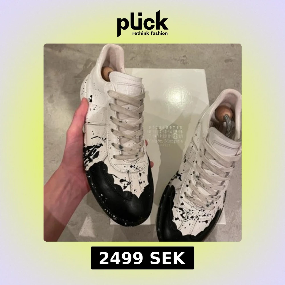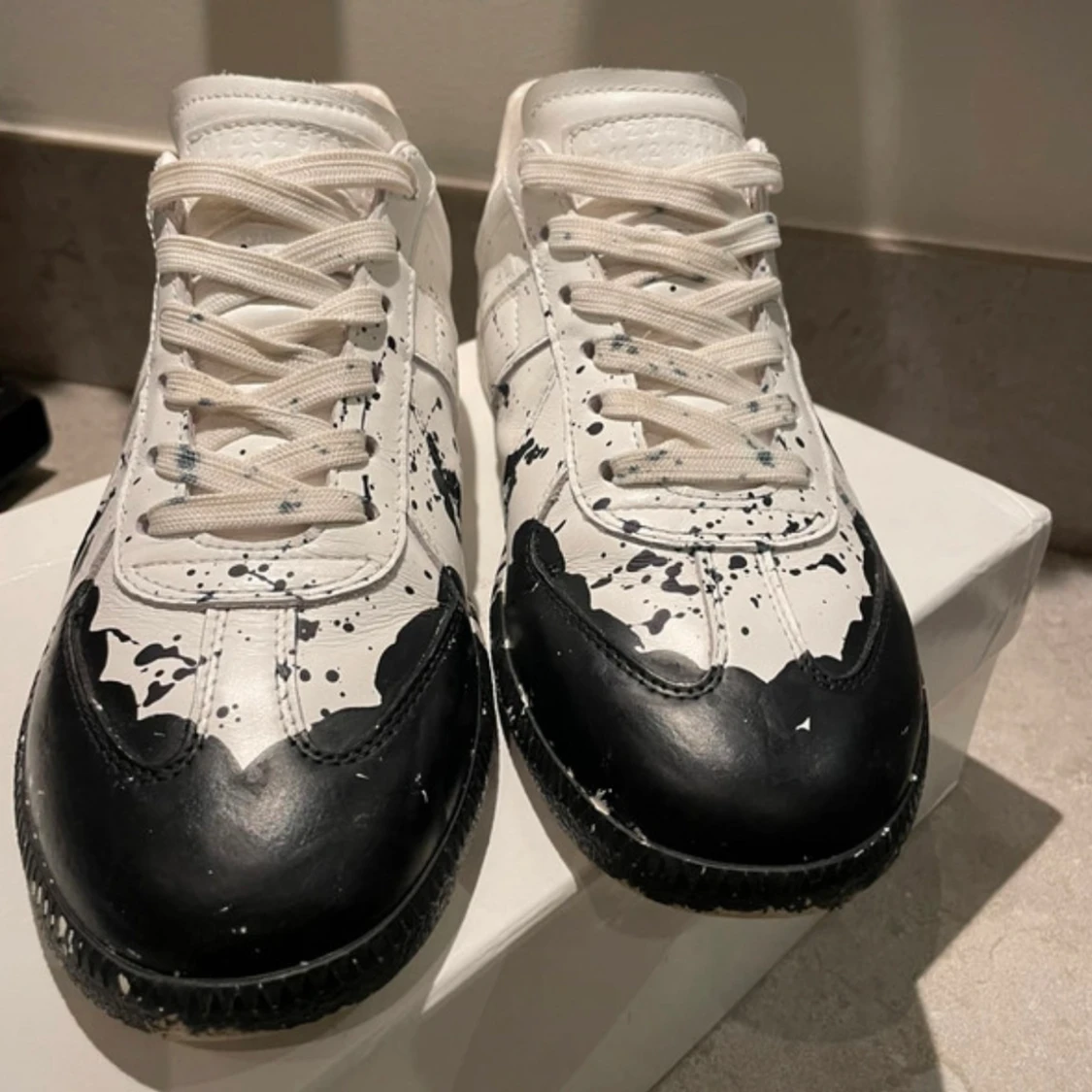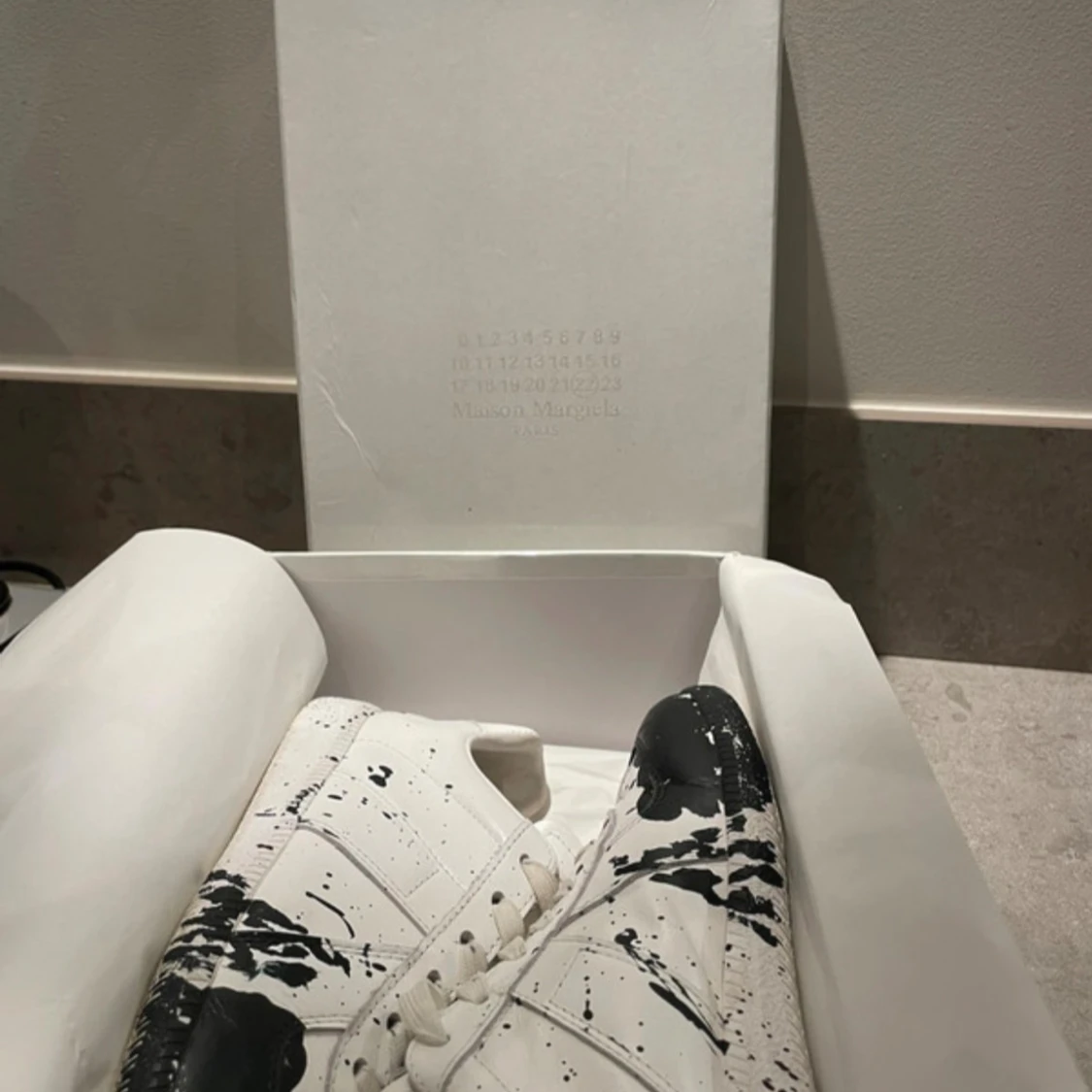 Tjena, säljer dessa riktigt feta gats från Maison margiela, dom är vita med svart paintsplatter och i riktigt bra skick. Box medföljer, skriv vid minsta fundering!