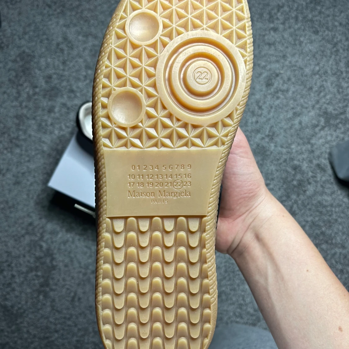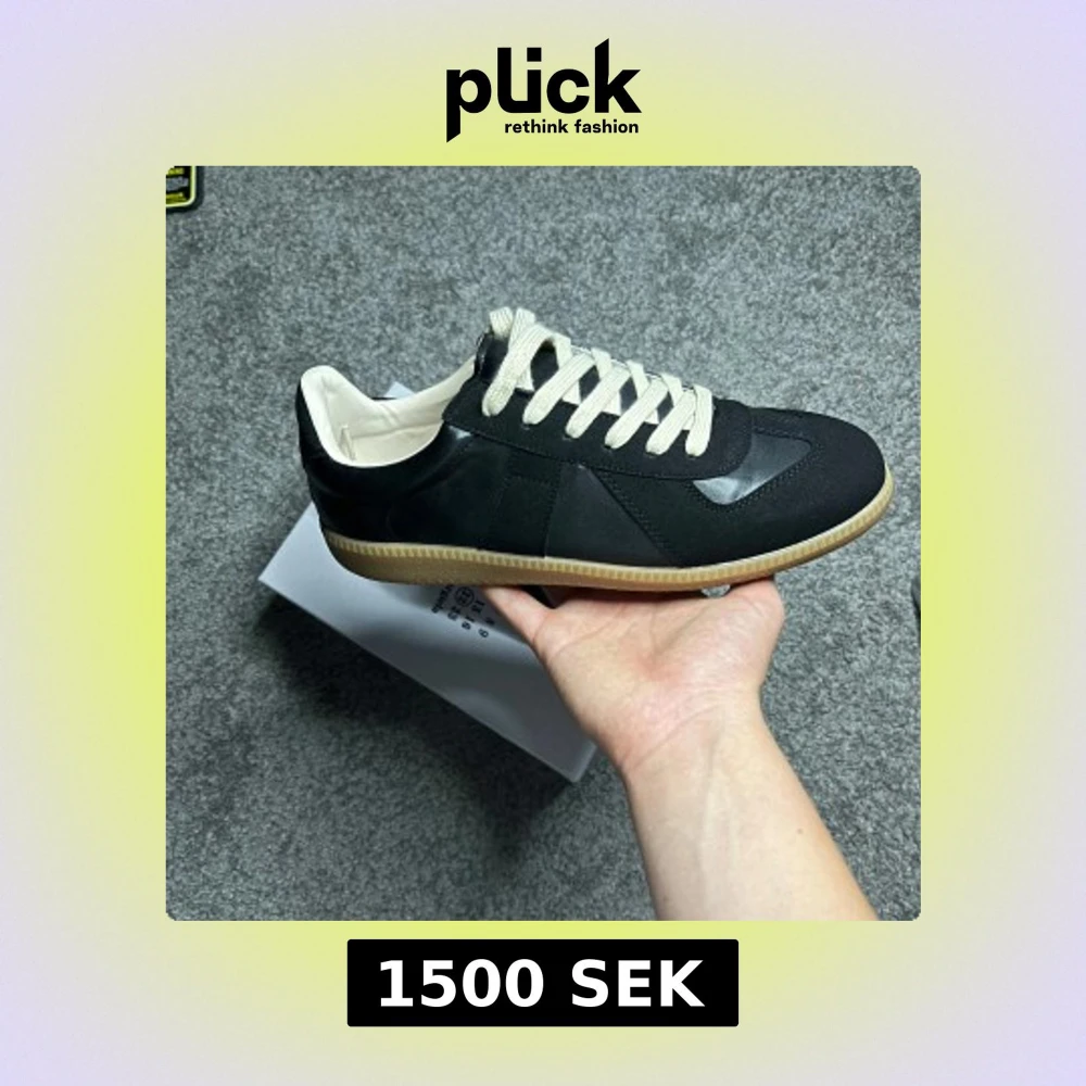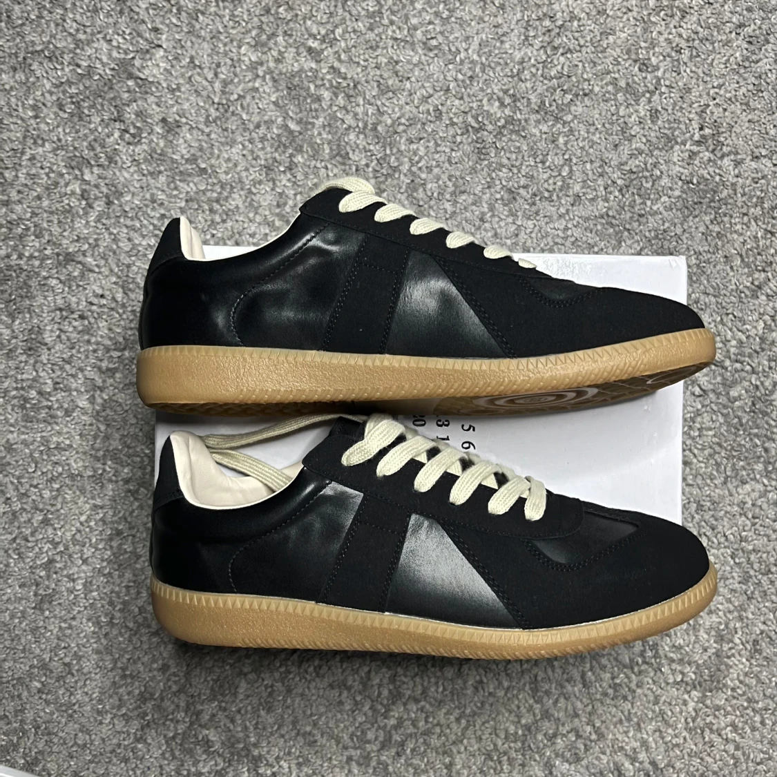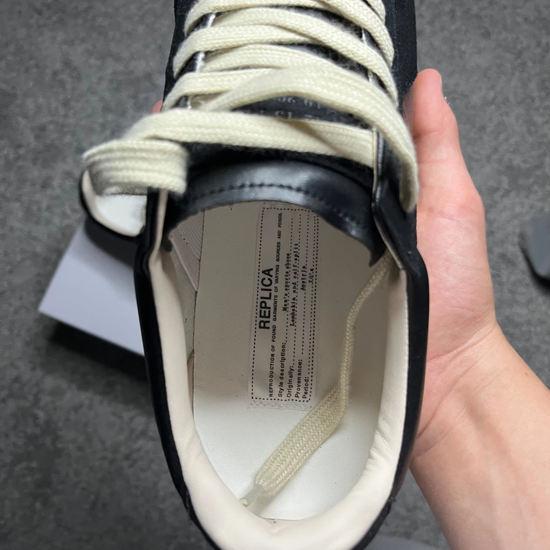 Maison Margiela sneakers i svart skinn och mocka med vita snören och beige gummisula. Klassisk low-top siluett med rund tå och stilren design. Perfekta för dig som gillar minimalistisk och tidlös streetstyle. Icke äkta