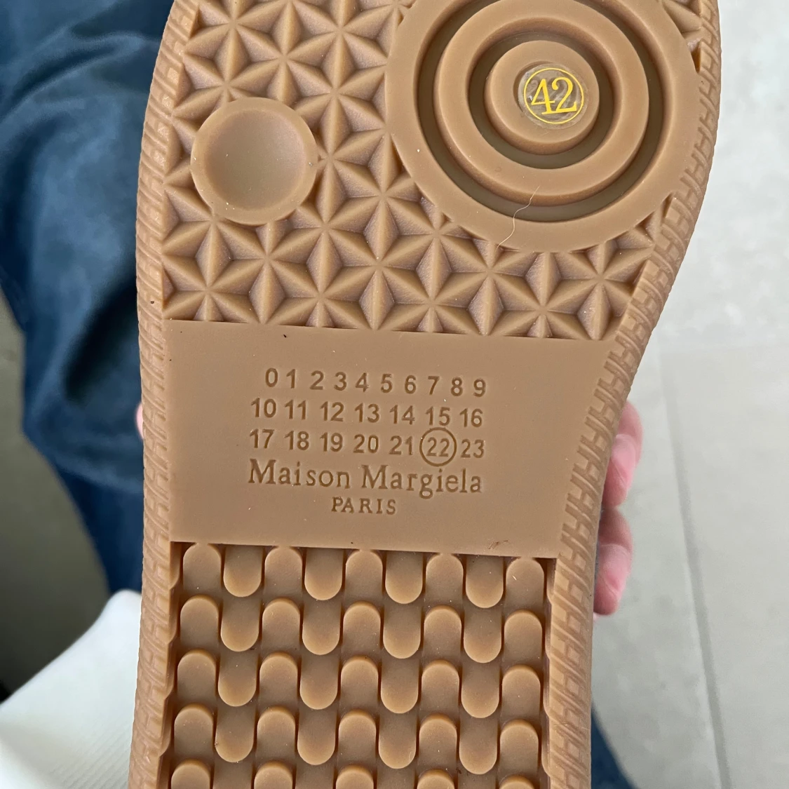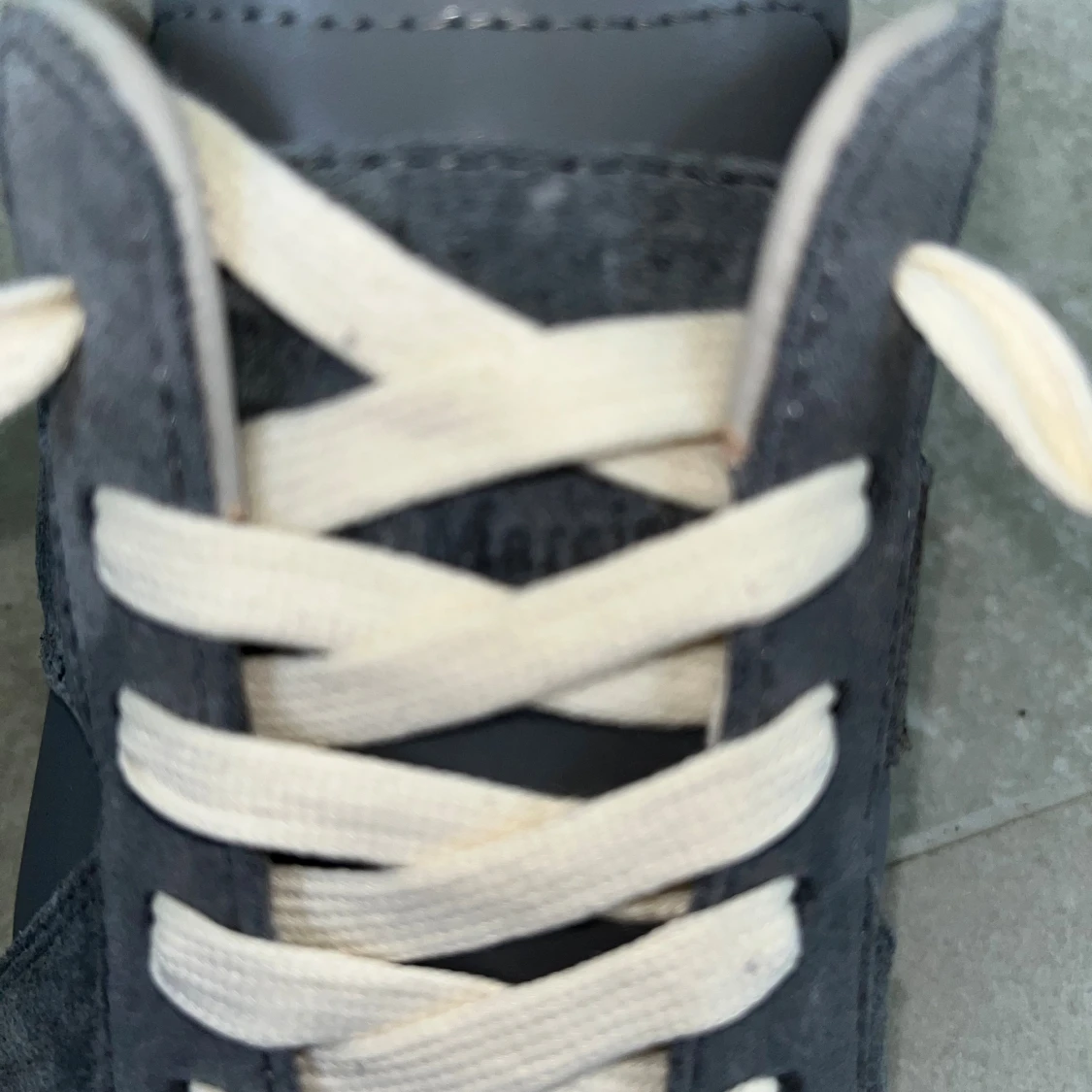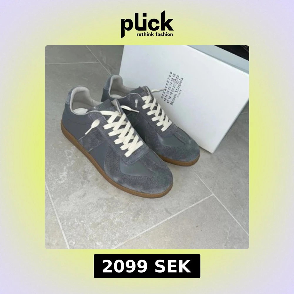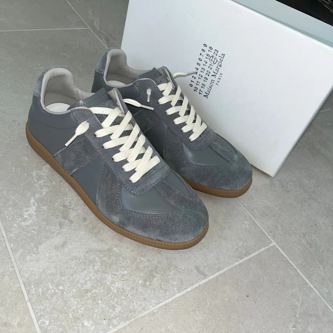 Maison Margiela sneakers i grå mocka och skinn med vita snören och klassisk gummisula. Snygg minimalistisk design med rund tå och diskreta paneler. Perfekta för dig som gillar stilrena och exklusiva sneakers.