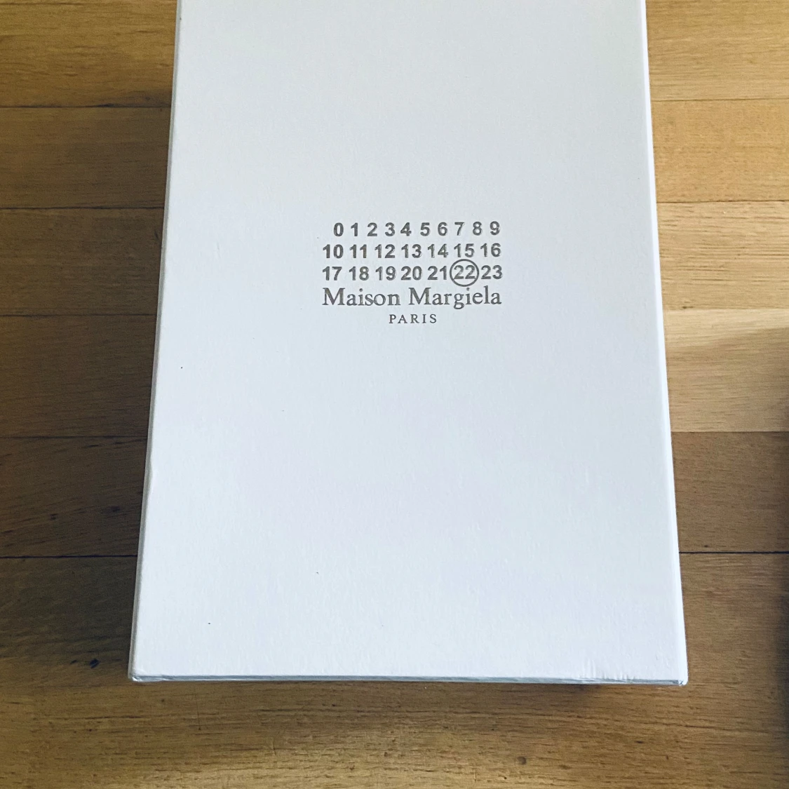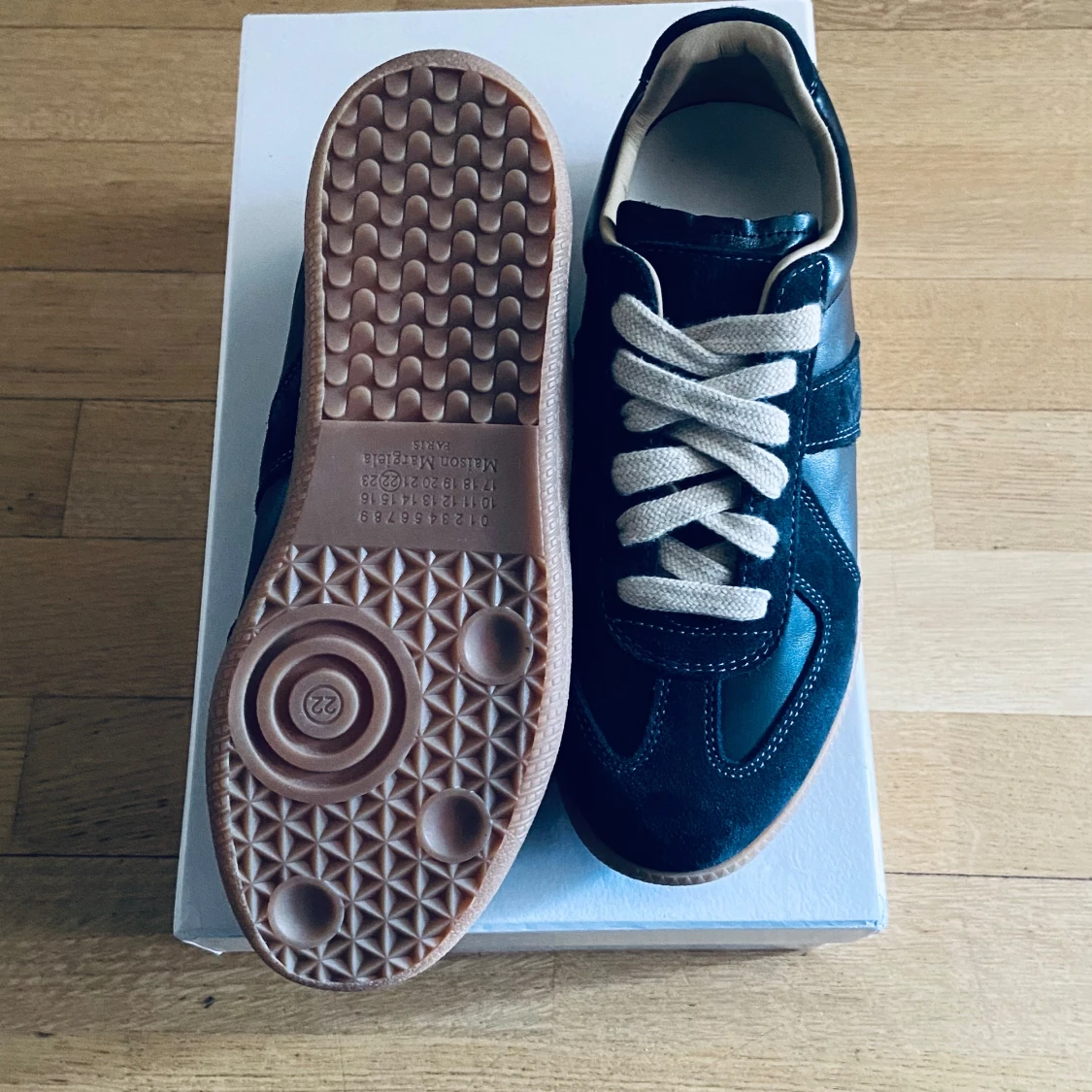 Maison Margiela sneakers i svart skinn och mocka med vita snören och gummisula. Klassisk och stilren modell med rund tå och kontrasterande detaljer. Perfekta för dig som gillar minimalistisk design och vill ha något unikt på fötterna.
