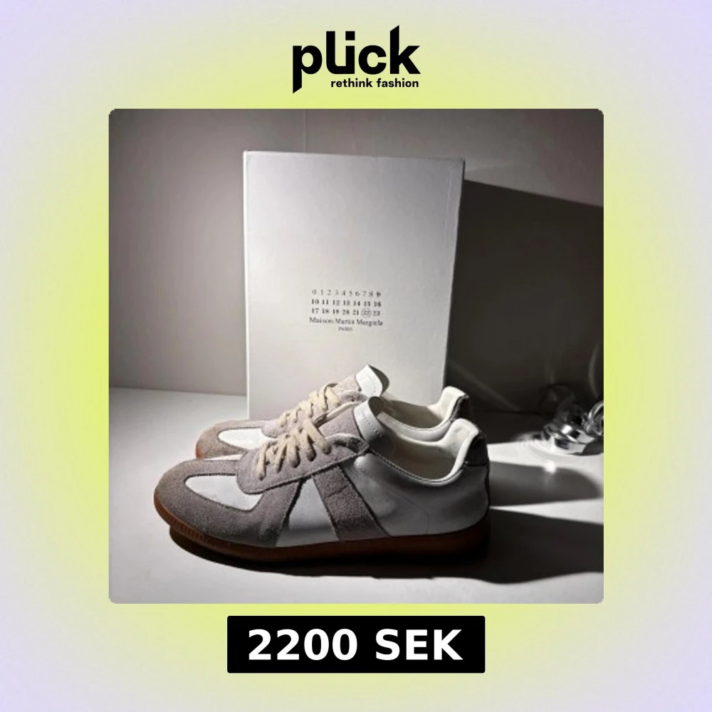 Ett par väldigt snygga och trendiga Maison Margiela skor i färgen vit och beige/grå. Dom är i ett bra skick trots lite användning. Det är dock ett litet hål i sulan som kommer från att jag använt dom. Box och dustbag följer med såklart!