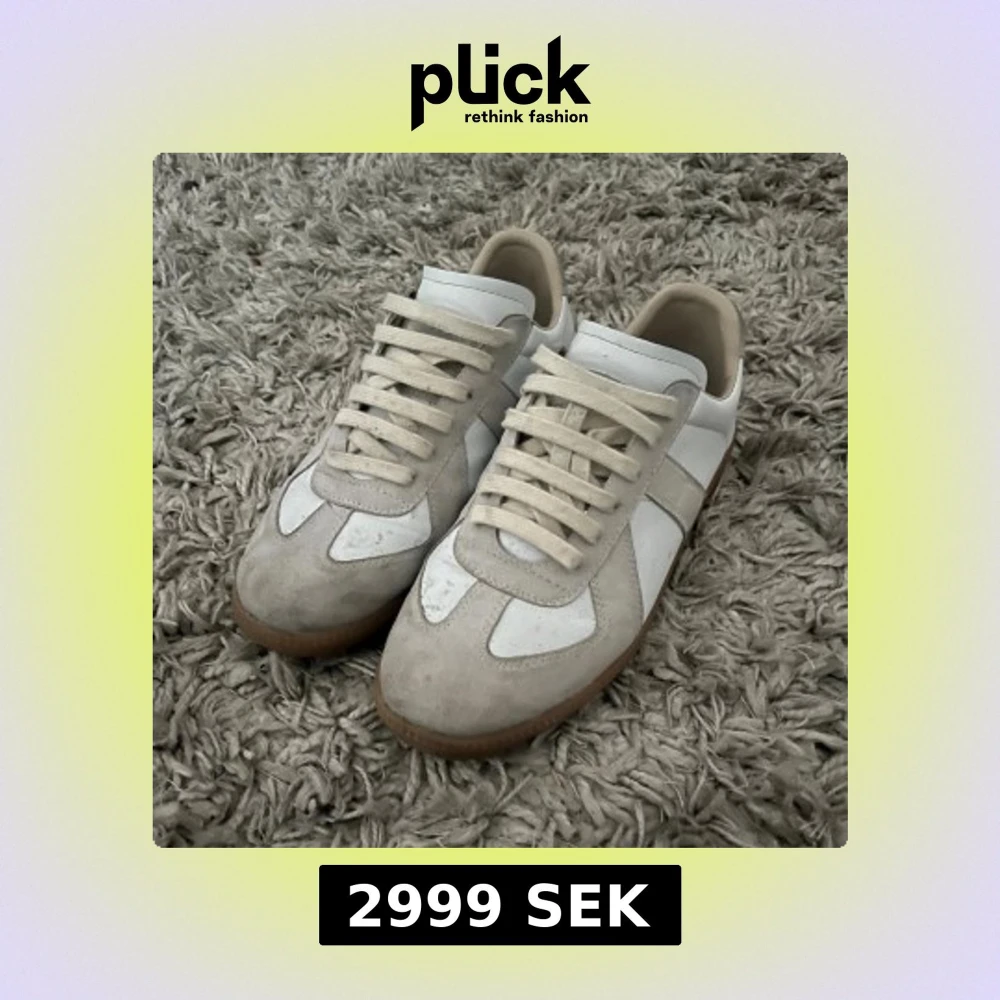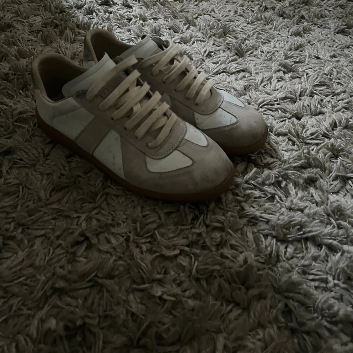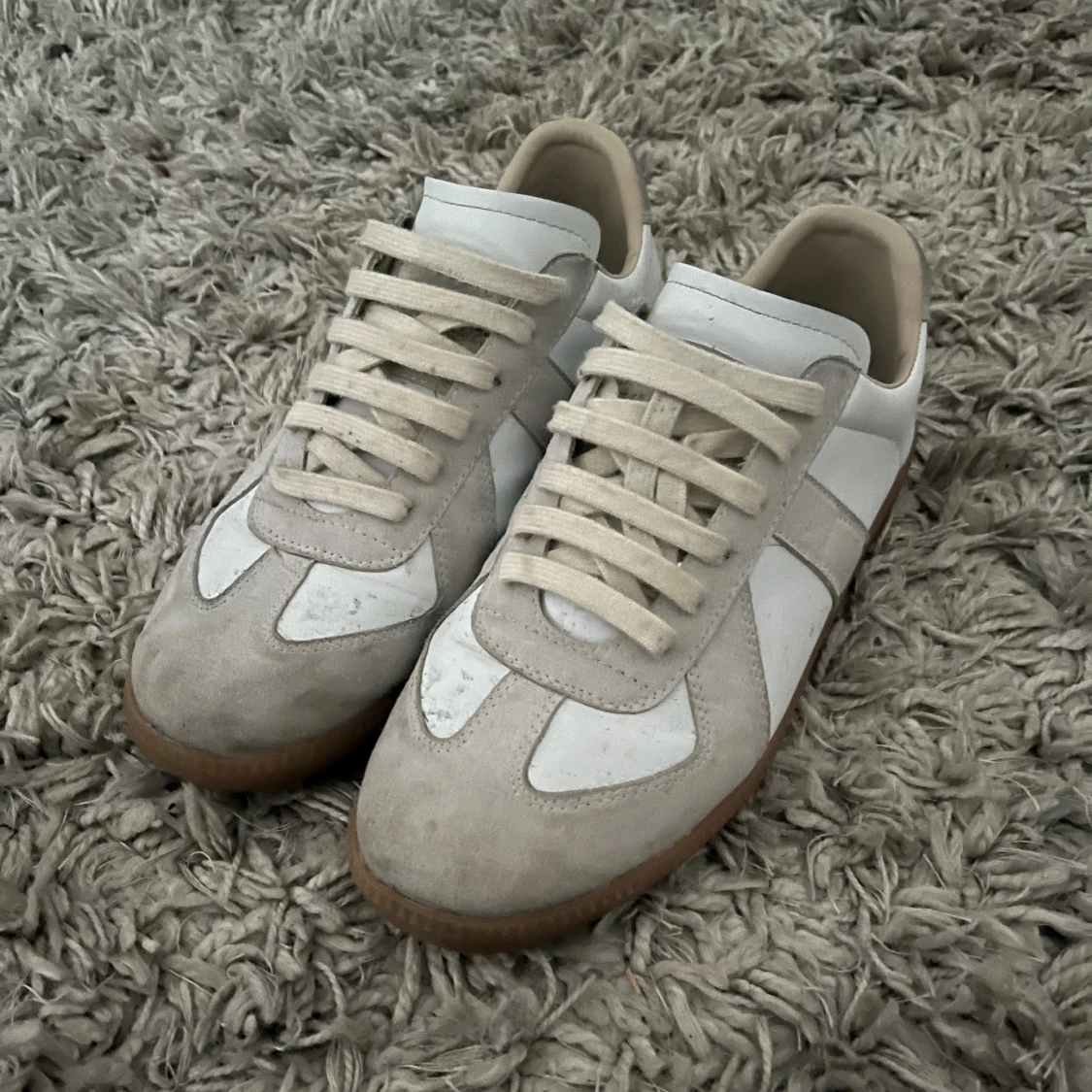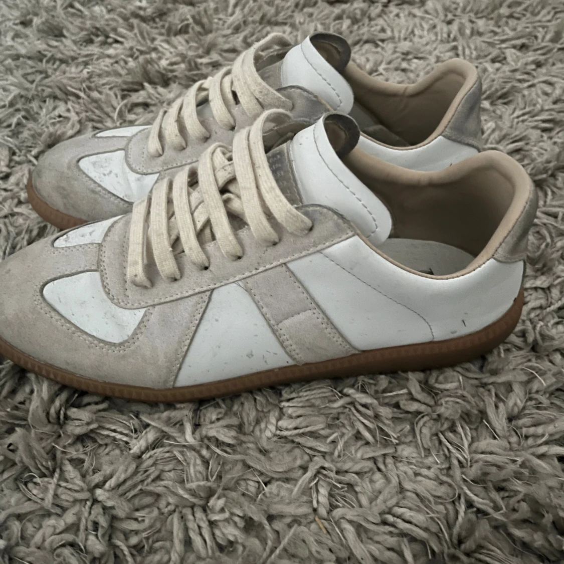 Säljer ett par stilrena sneakers i vitt och beige med snygga mockadetaljer och klassisk gummisula. Skorna har snörning och en låg profil som passar till många olika outfits. Perfekta för dig som gillar minimalistisk och clean stil.