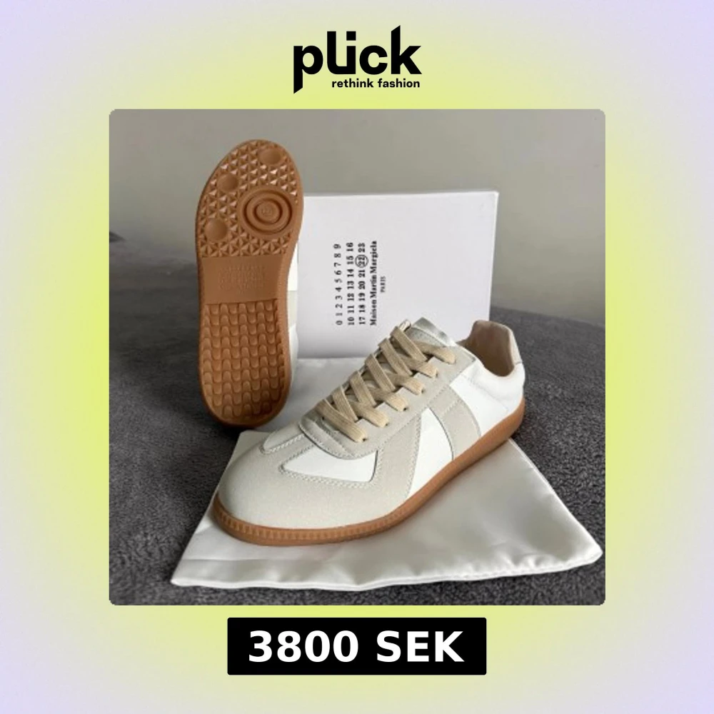 Maison Margiela sneakers i vit och beige med klassisk gummisula i brunt. Skorna har snygga paneler i skinn och mocka, rund tå och beige snörning. Ikonisk logga på plösen och stilren design som ger en clean vibe.