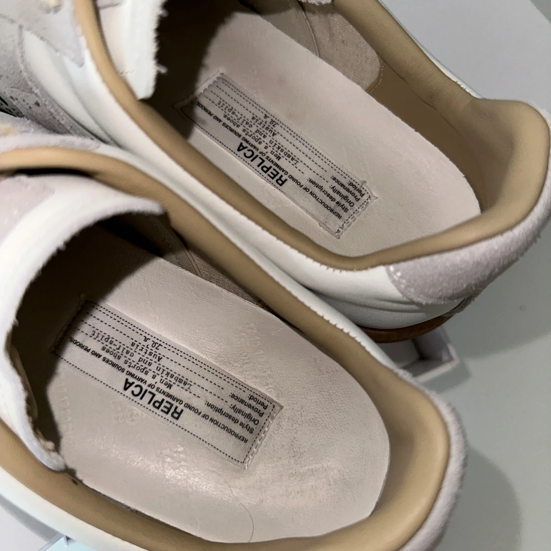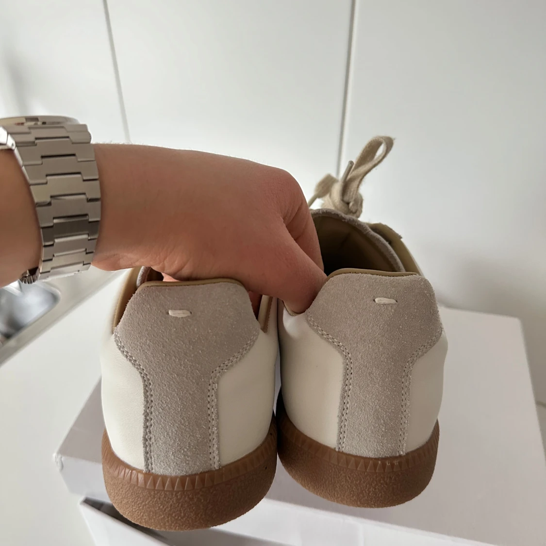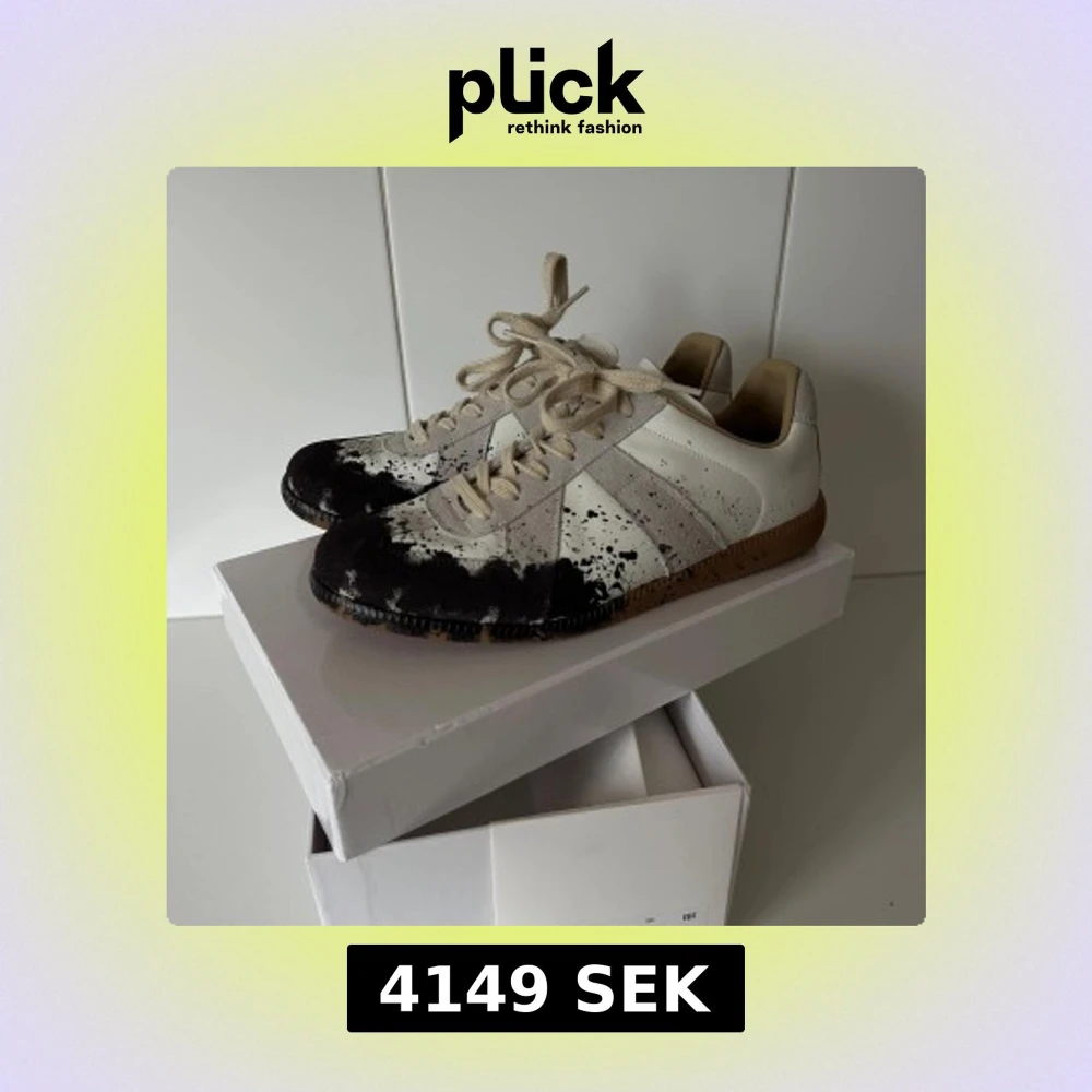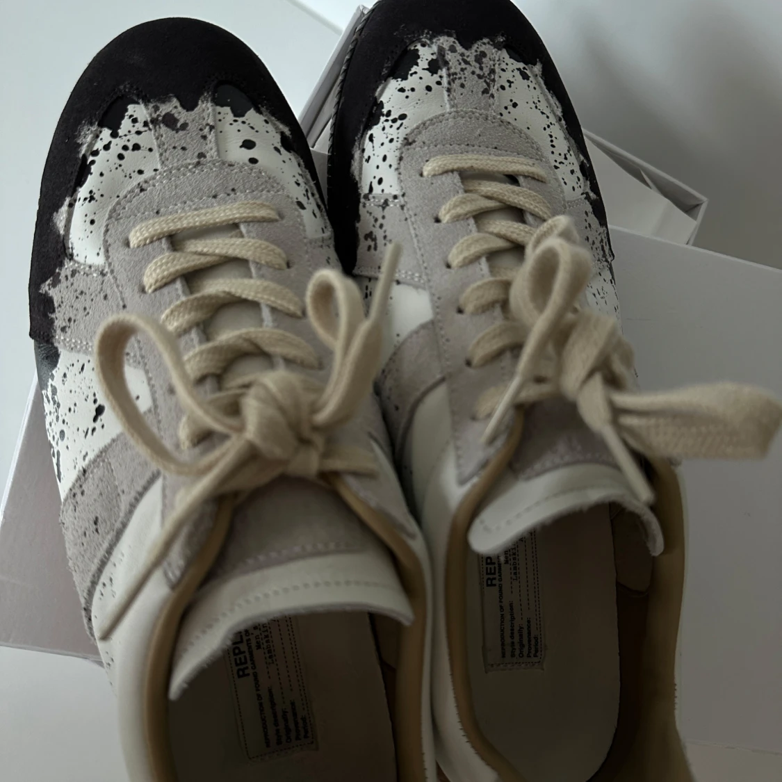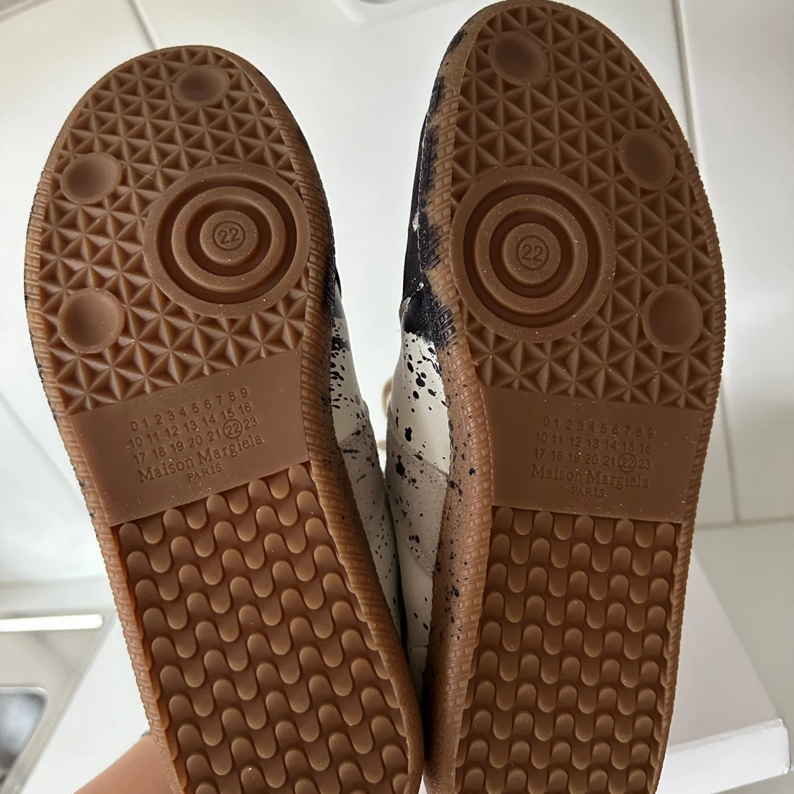Maison Margiela Gats med mörkblå paintsplatter i nyskick🎨! Allt og förutom dustbags, storlek 45 men passar även 44! Aldrig använda och har bara legat i garderoben i någon månad då jag inte tyckte de passade just min stil, tveka inte på att skriva✍️!