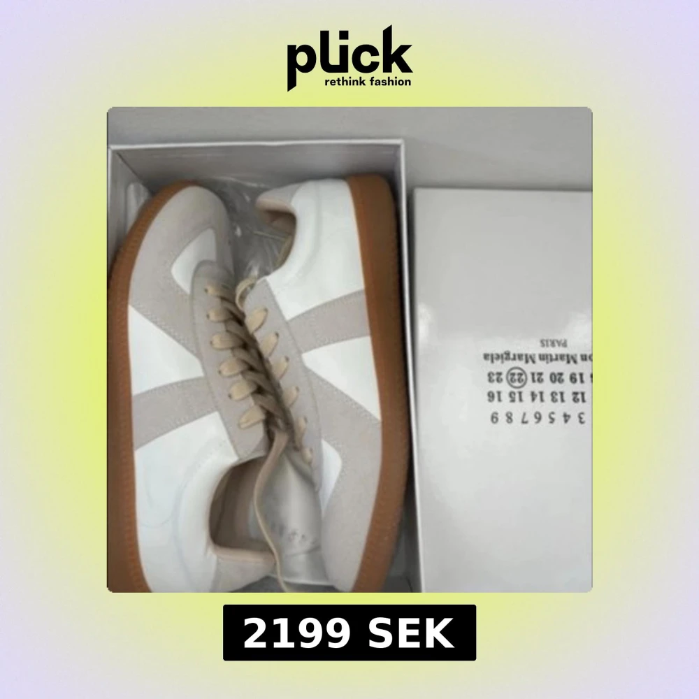 Maison Margiela sneakers med beige mockadetaljer och vita paneler i skinn. Klassisk gummisula i brunt och snygga beige snören. Perfekt för dig som gillar stilrena och trendiga sneakers med en lyxig touch.