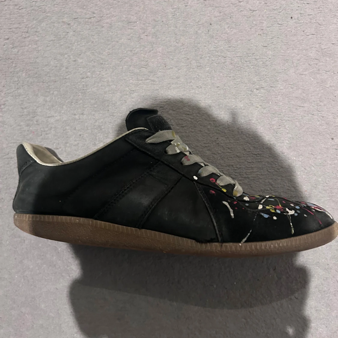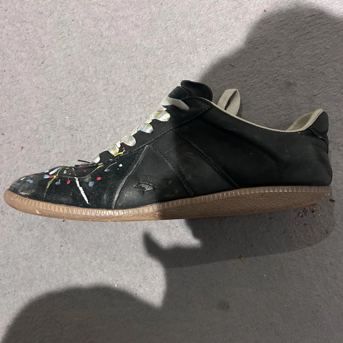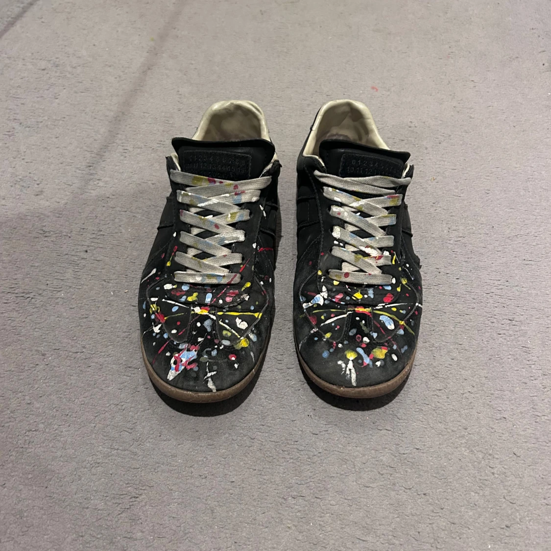 Maison Margiela sneakers i svart med unikt färgstänk i gult, vitt, blått och rött över tån och sidorna. Skorna har grå snörning, bruna gummisulor och klassisk låg profil. Perfekta för dig som vill sticka ut med en konstnärlig vibe.