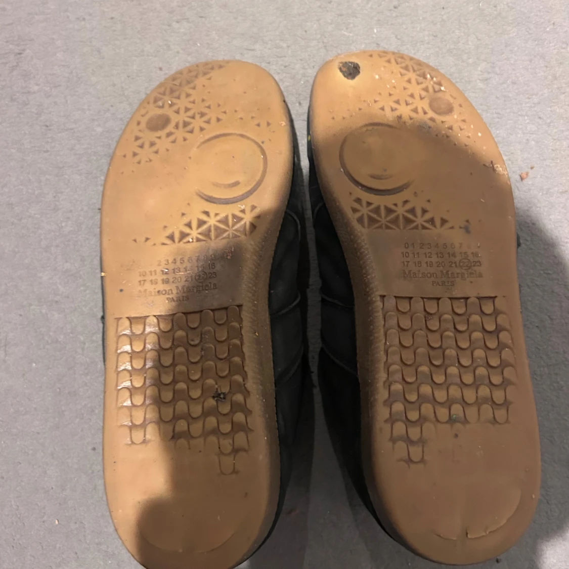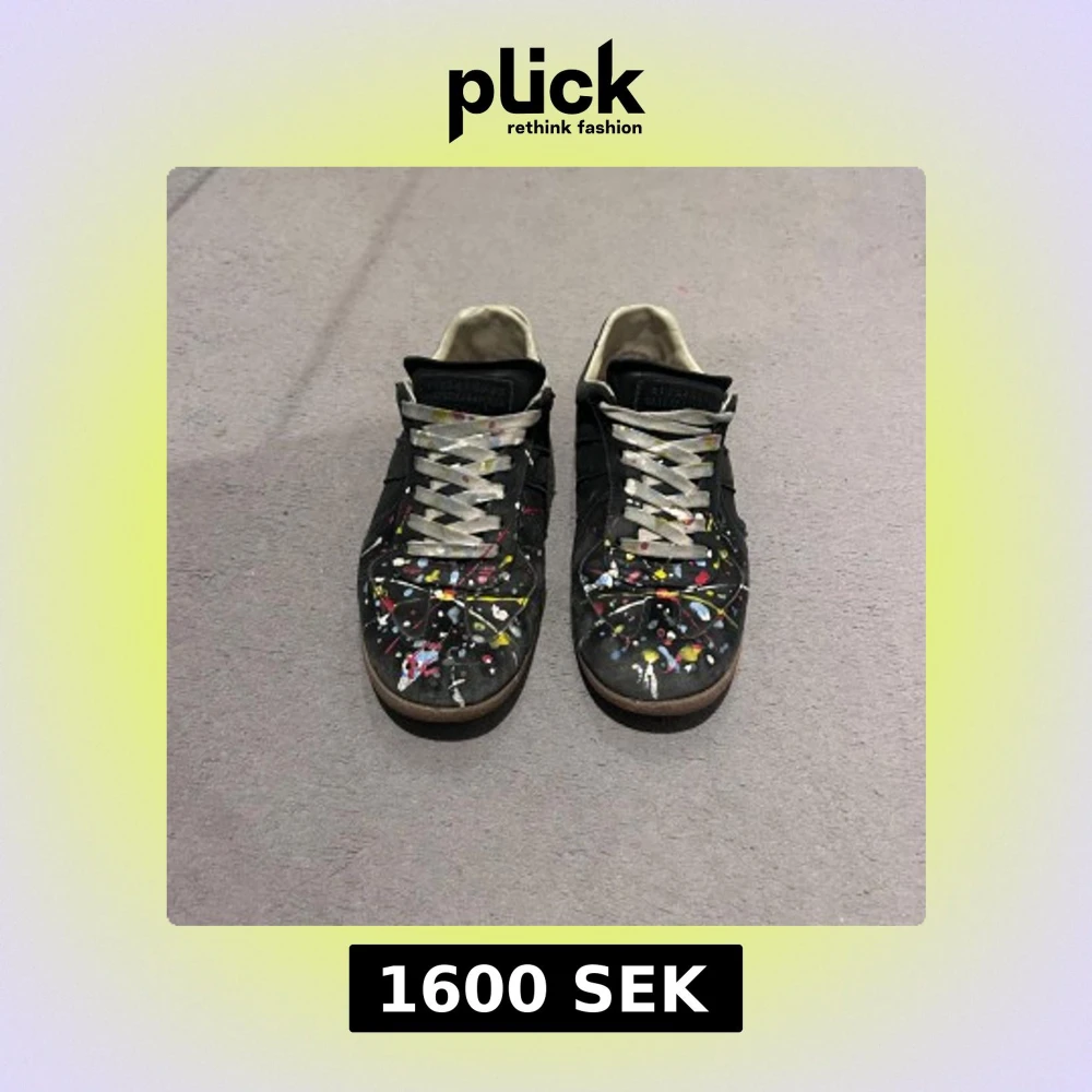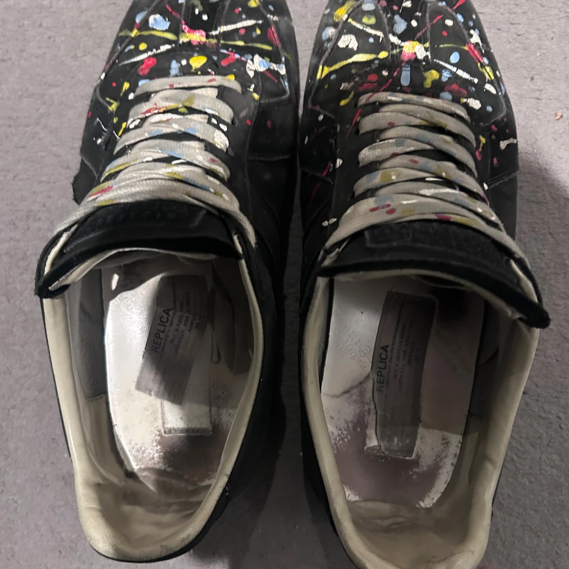 Maison Margiela sneakers i svart med unikt färgstänk i gult, vitt, blått och rött över tån och sidorna. Skorna har grå snörning, bruna gummisulor och klassisk låg profil. Perfekta för dig som vill sticka ut med en konstnärlig vibe.