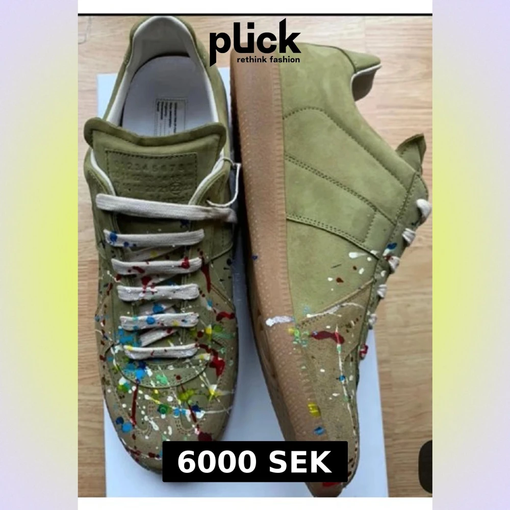 Unika sneakers från Maison Margiela i olivgrön mocka med coola färgstänk i blått, rött, gult och vitt. Skorna har rund tå, platt sula och vita snören. Perfekt för dig som gillar konstnärlig och kreativ stil.