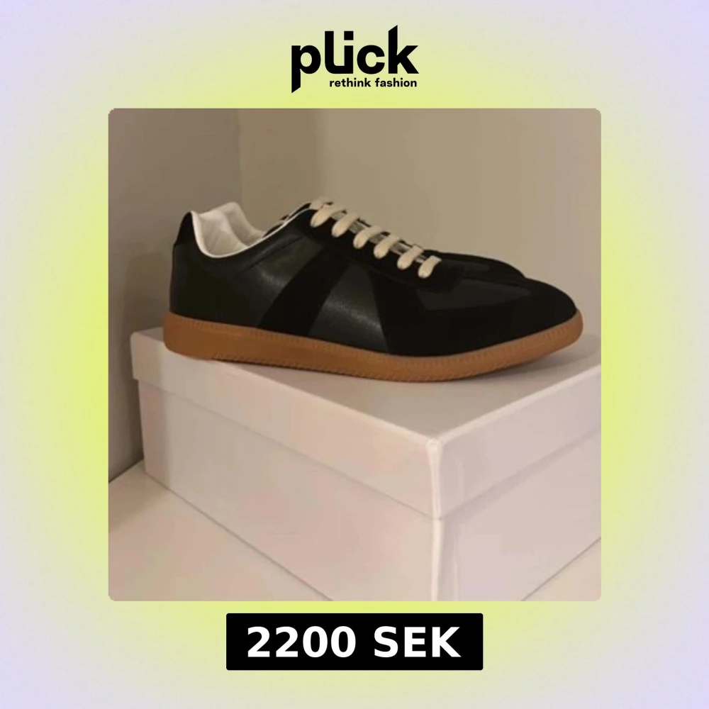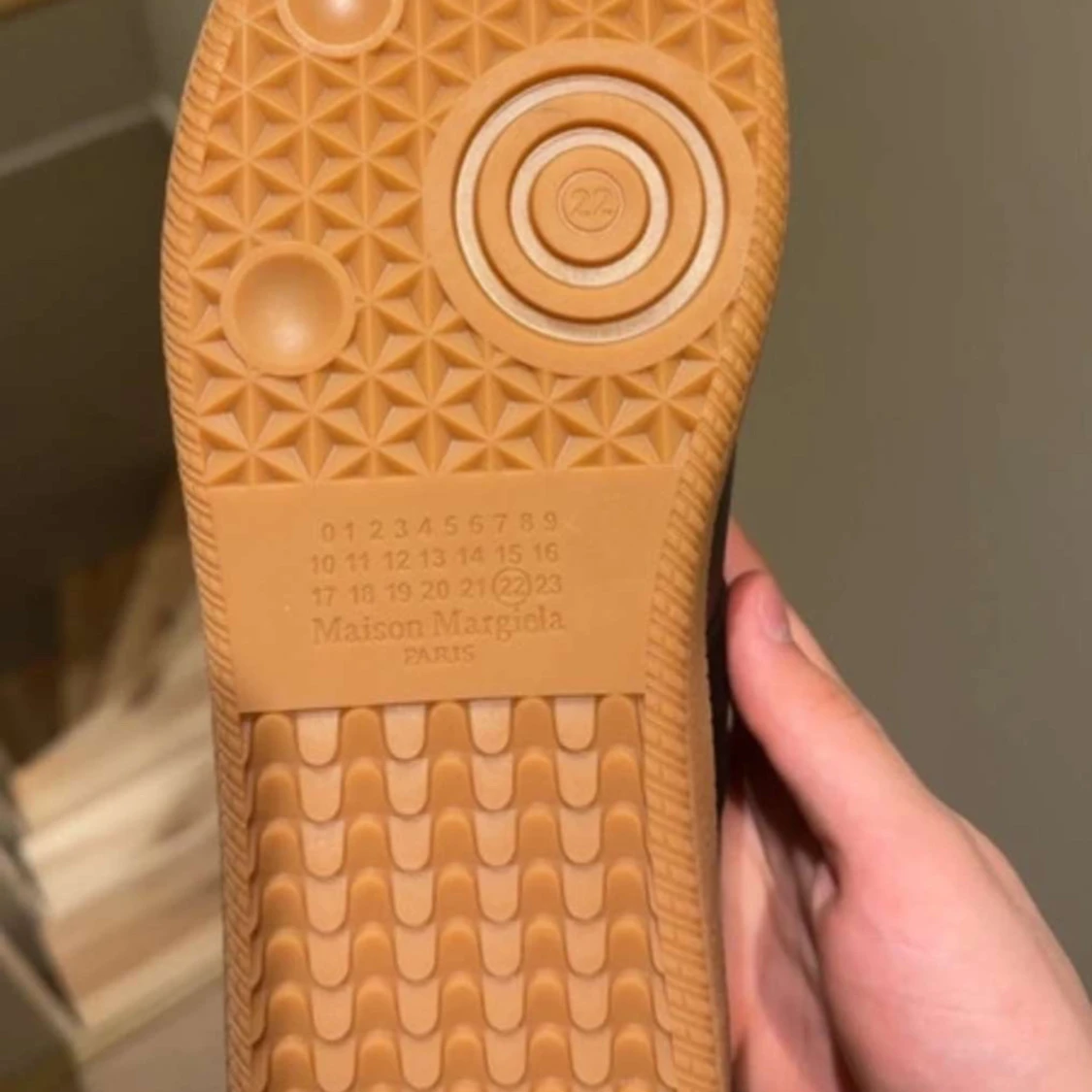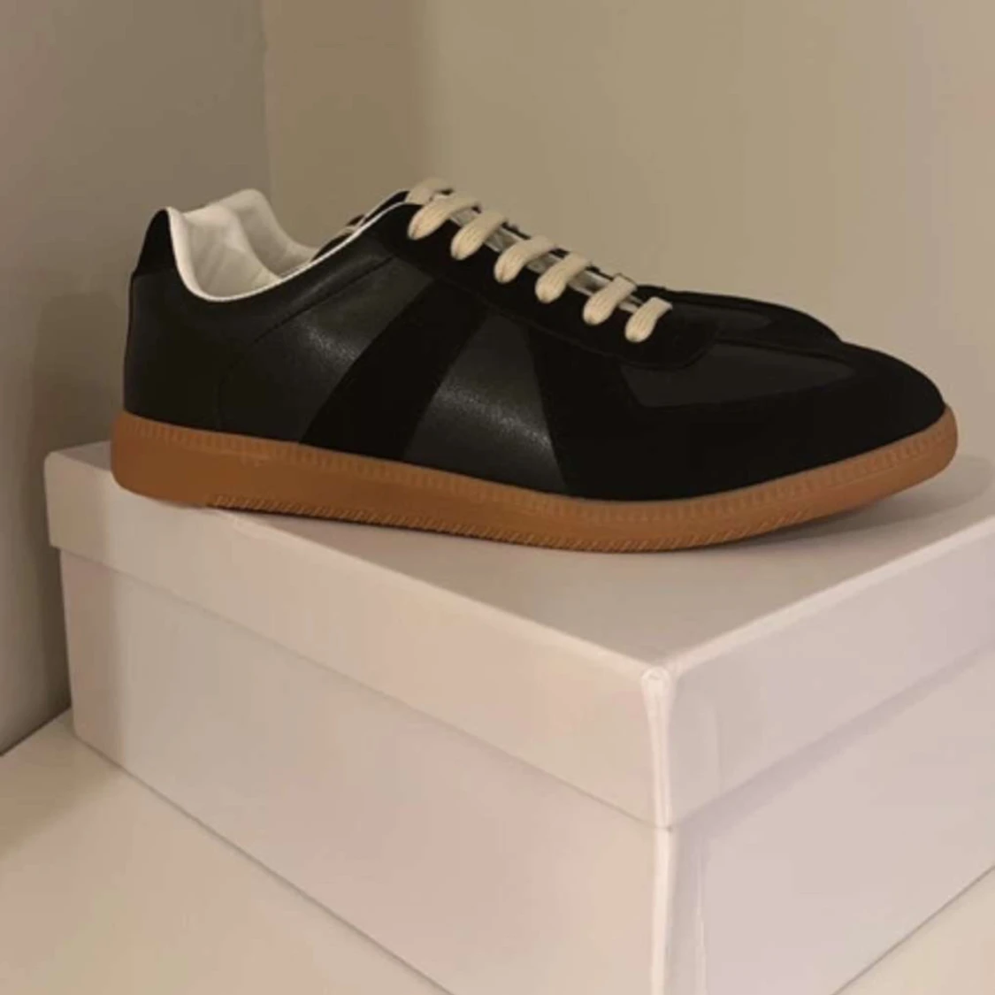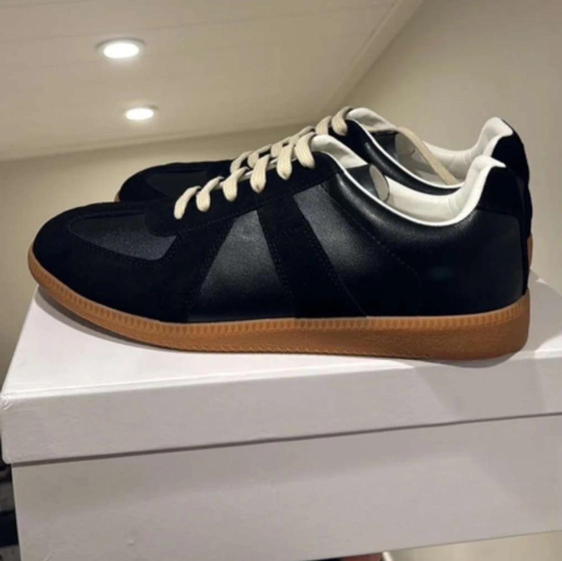 Maison Margiela sneakers i svart skinn och mocka med vita snören och kontrasterande gummisula i brunt. Klassisk låg modell med rund tå och stilren design. Perfekta för dig som gillar minimalistisk stil. Inga defekter alls. Priset kan diskuteras vid snabb affär. Vid fler funderingar kontakta gärna!
