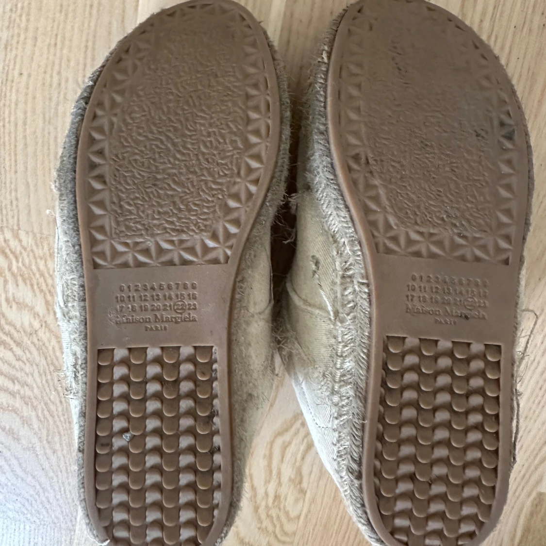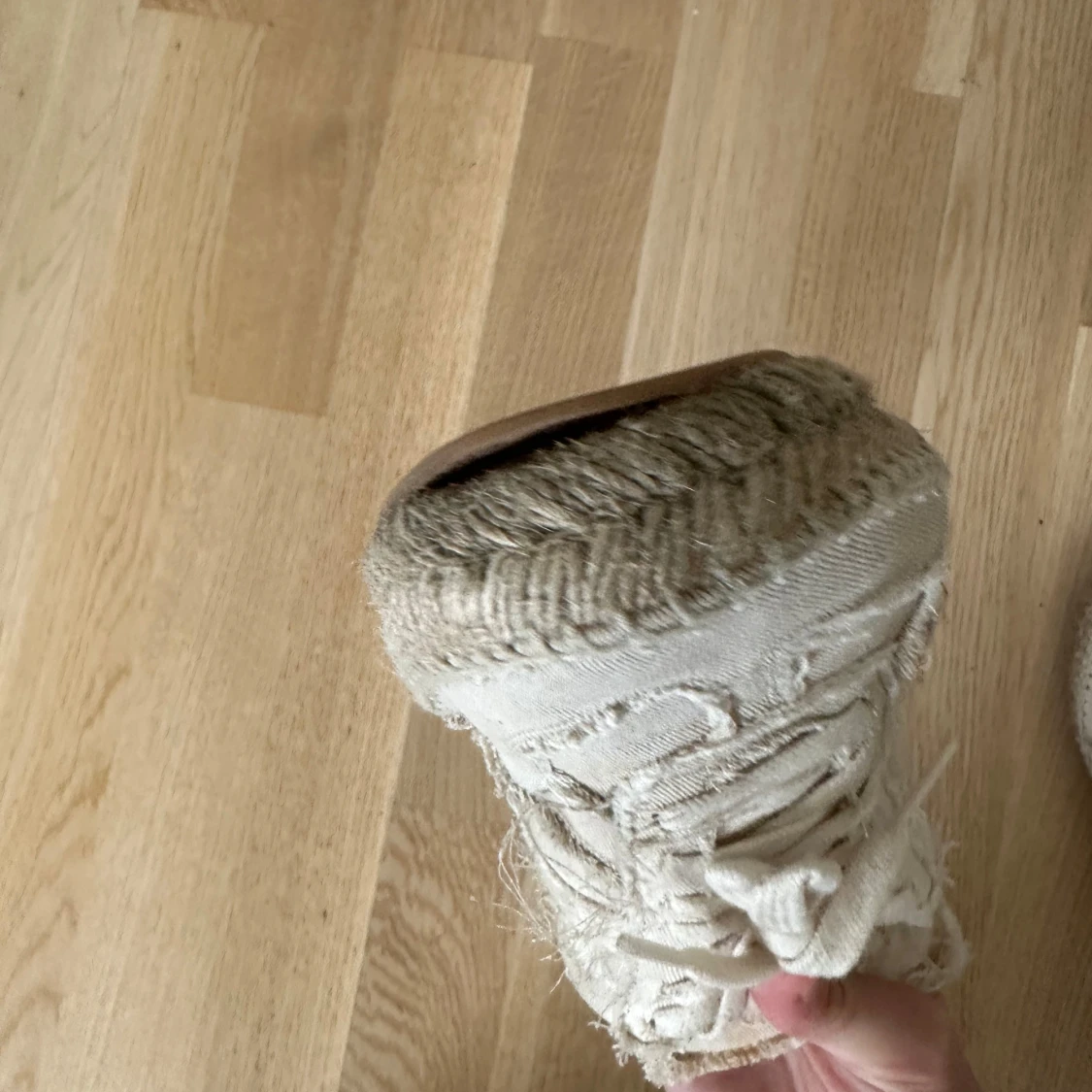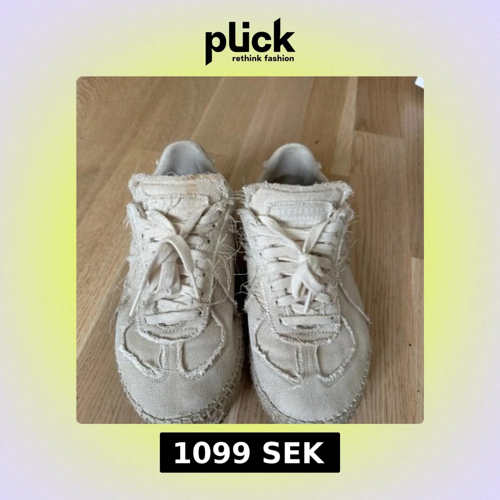 Maison Margiela sneakers i beige canvas med fransiga detaljer och snörning. Sulan är i repstil med gummidetaljer undertill för extra grepp. Unik design med råa kanter och tydlig Margiela-stil. Perfekta för dig som gillar statement-skor med edge. De är gats har inte använts så mycket och är storlek 37 men passar 38