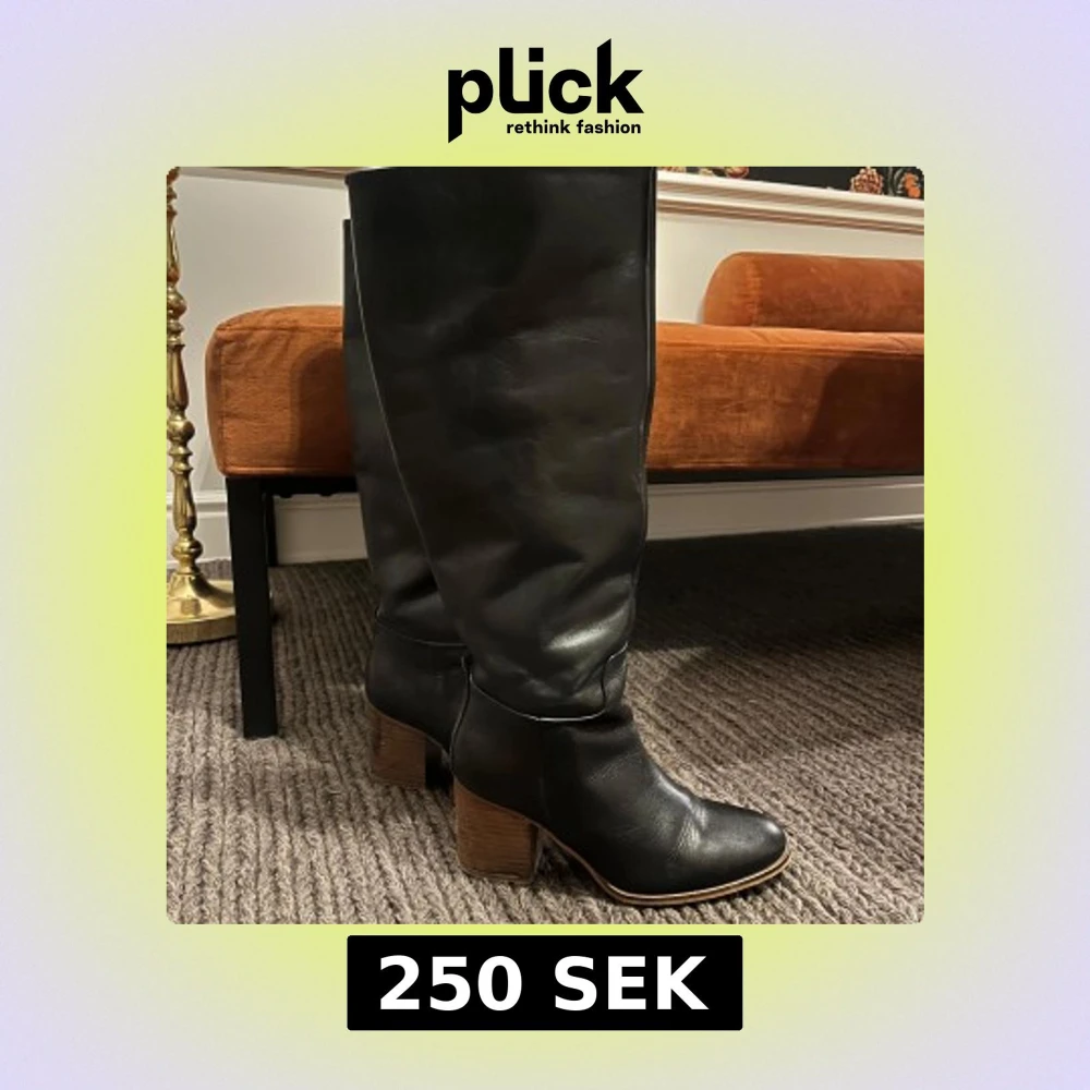 Snygga svarta stövlar i skinn med rund tå och bred träfärgad klack. Stövlarna har en klassisk och stilren look med lite slouchig passform på skaftet. Perfekta att styla med kjol eller jeans för en trendig vibe.