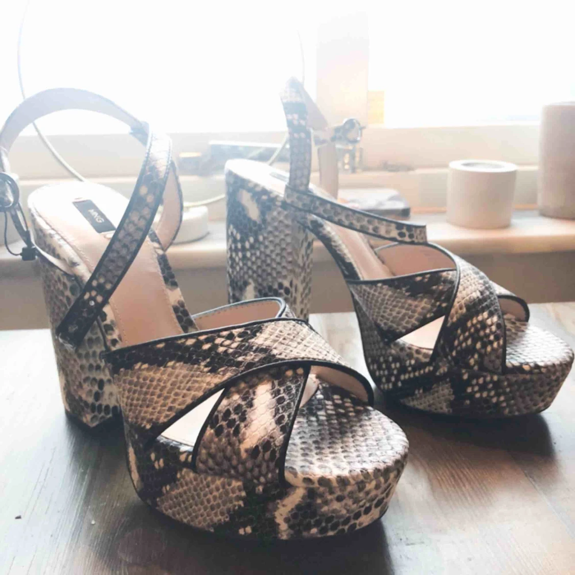 Så snygga klackar i ormskinnsmönster från mango. Endast använda en gång så i fint skick! Köptes för 499 kr i butik. Storlek 38!