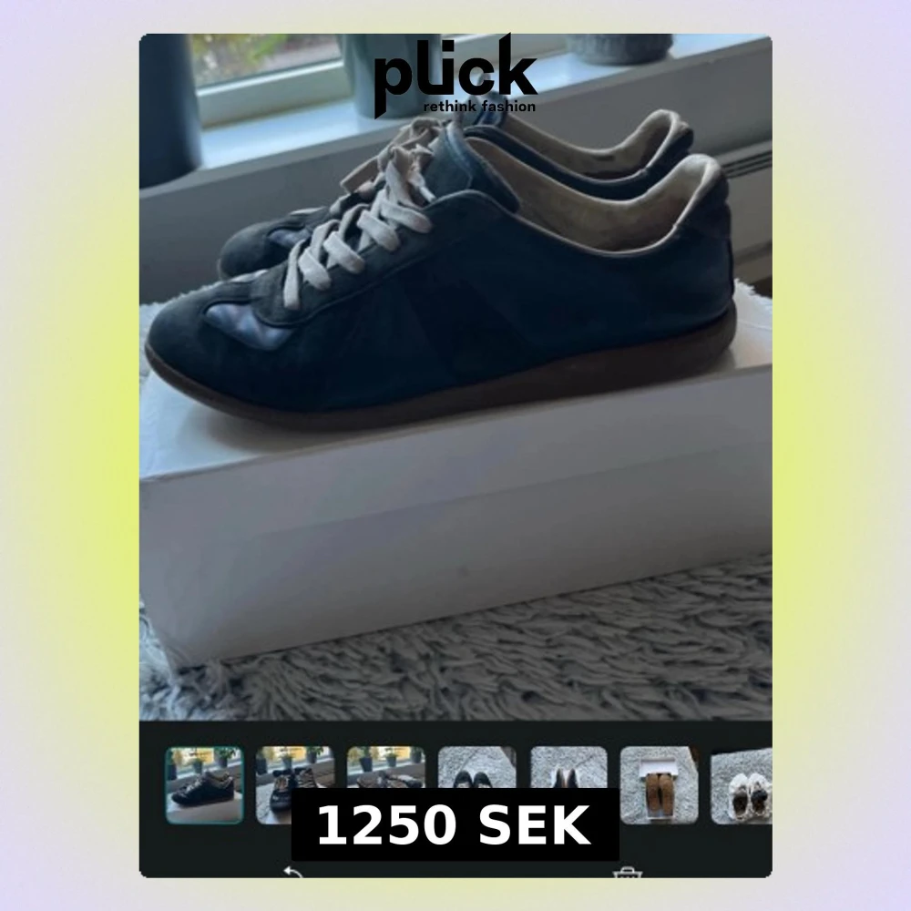 Säljer nu dessa navy Maison Margiela gats. Jag säljer dem för att jag inte orkar fixa till dem, men jag anser att med lite tid och resurser borde det gå att återuppliva skorna till viss del, och de går att sälja dyrare än vad jag säljer dem. Skolådan och dustbags ingår. Skorna är äkta Storlek 45, men de passar även bra för er som brukar ha 44 och även 43. Det finns en spricka i botten av skorna det borde gå att fixa hos en skomakare eller med shoe glue. Hål är bara problem om det regnar.