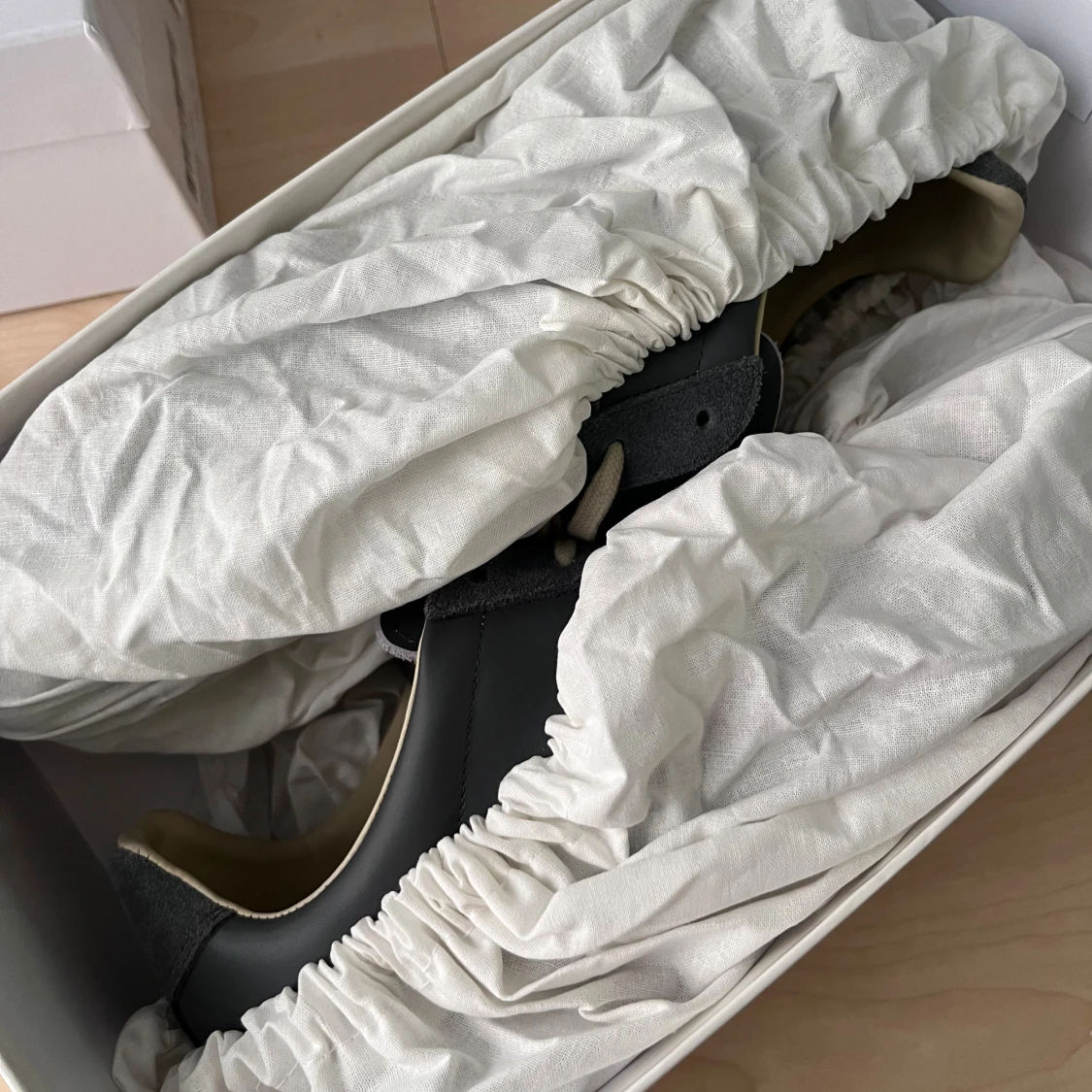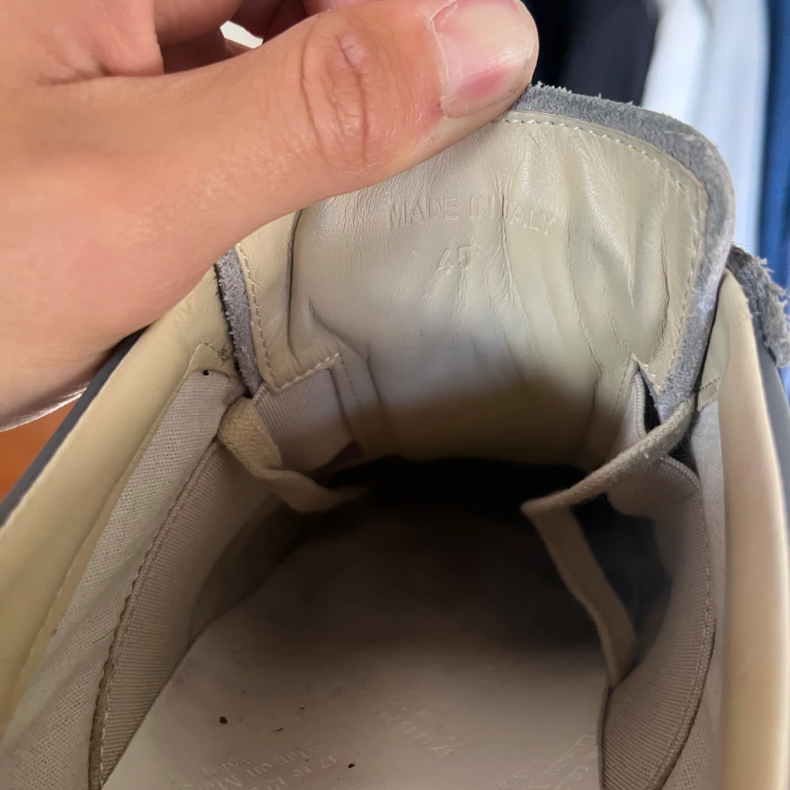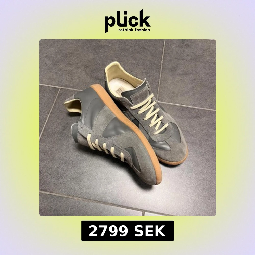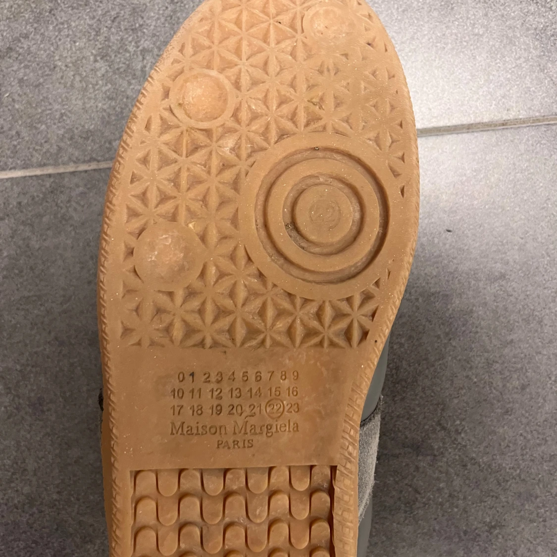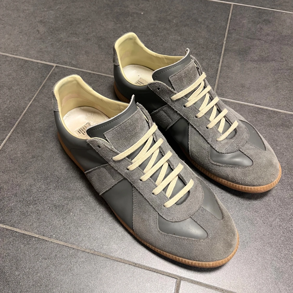 Maison Margiela sneakers i grå mocka och skinn med beige snörning och gummisula. Klassisk low-top siluett med rund tå och diskret branding på sulan. Tillverkade i Italien, stilrena och passar perfekt till streetwear eller casual outfits.