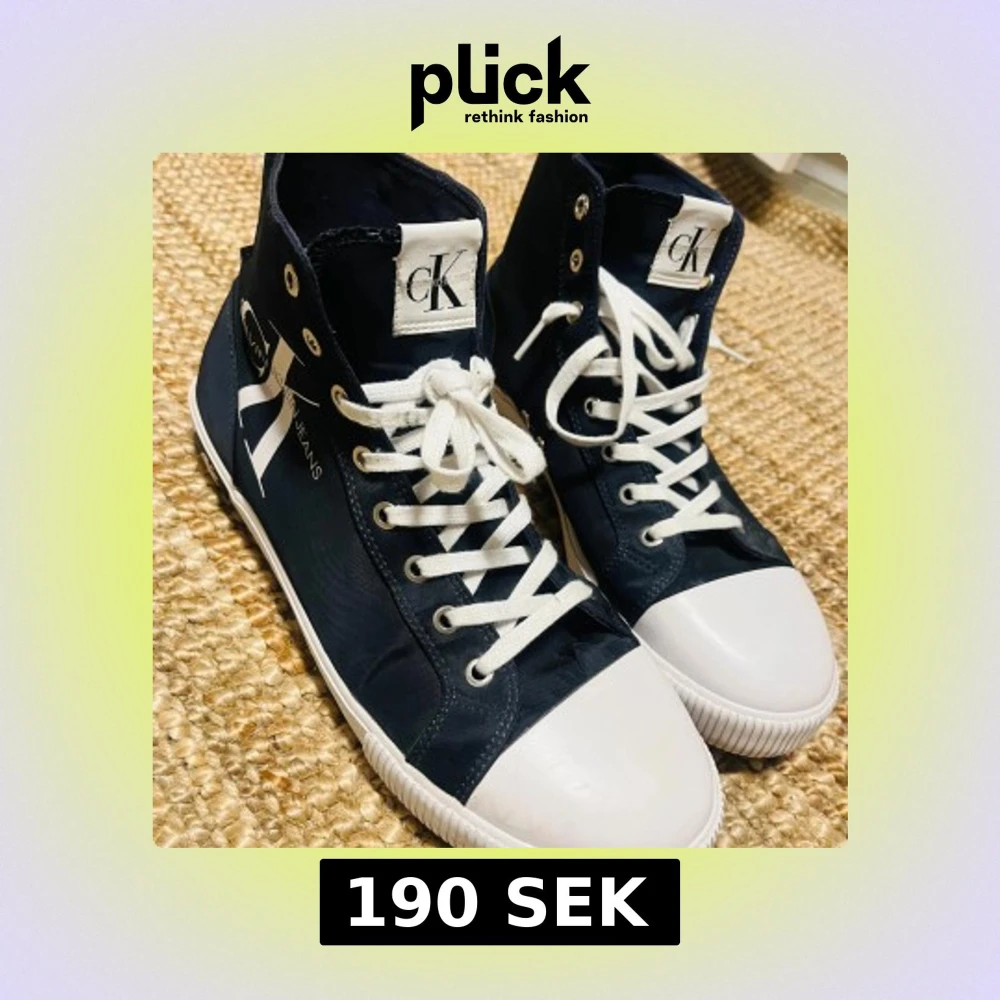 Snygga marinblå höga sneakers från Calvin Klein Jeans med vit tå och vita snören. Skorna har tydlig CK-logga på sidan och är gjorda i canvasmaterial. Klassisk rund tå och platt sula, perfekt för en clean streetstyle-look. Använda två gånger.