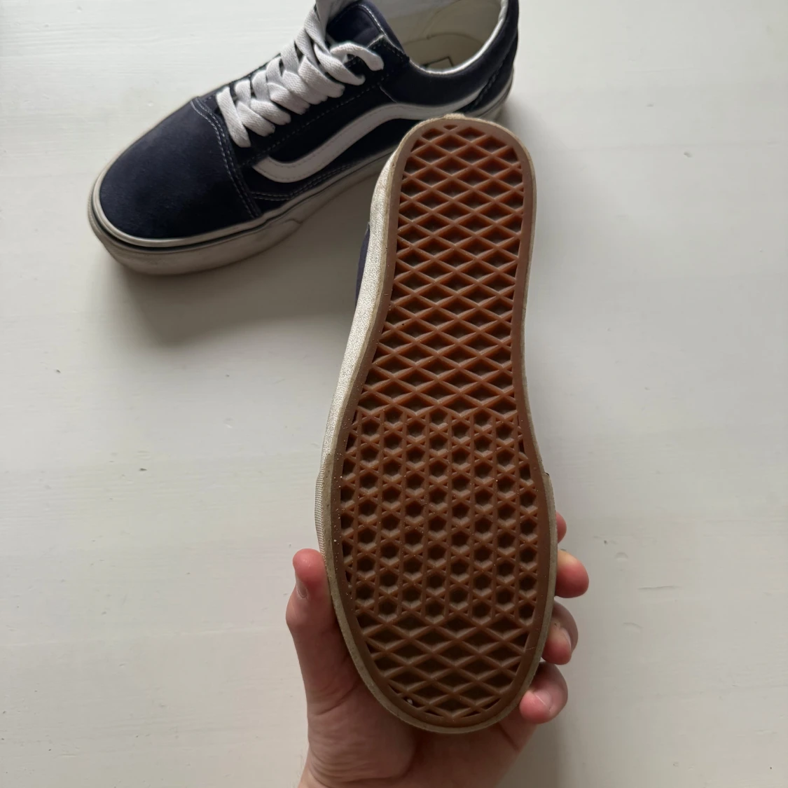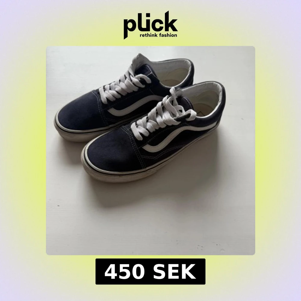 Säljer ett par klassiska mörkblå Vans sneakers med vit sula och vit snörning. Mycket fint skick sparsamt använda fåtalgånger! Skorna har den ikoniska vågiga sidodetaljen i vitt och en gummisula med rutmönster för bra grepp. Perfekta för en avslappnad stil.