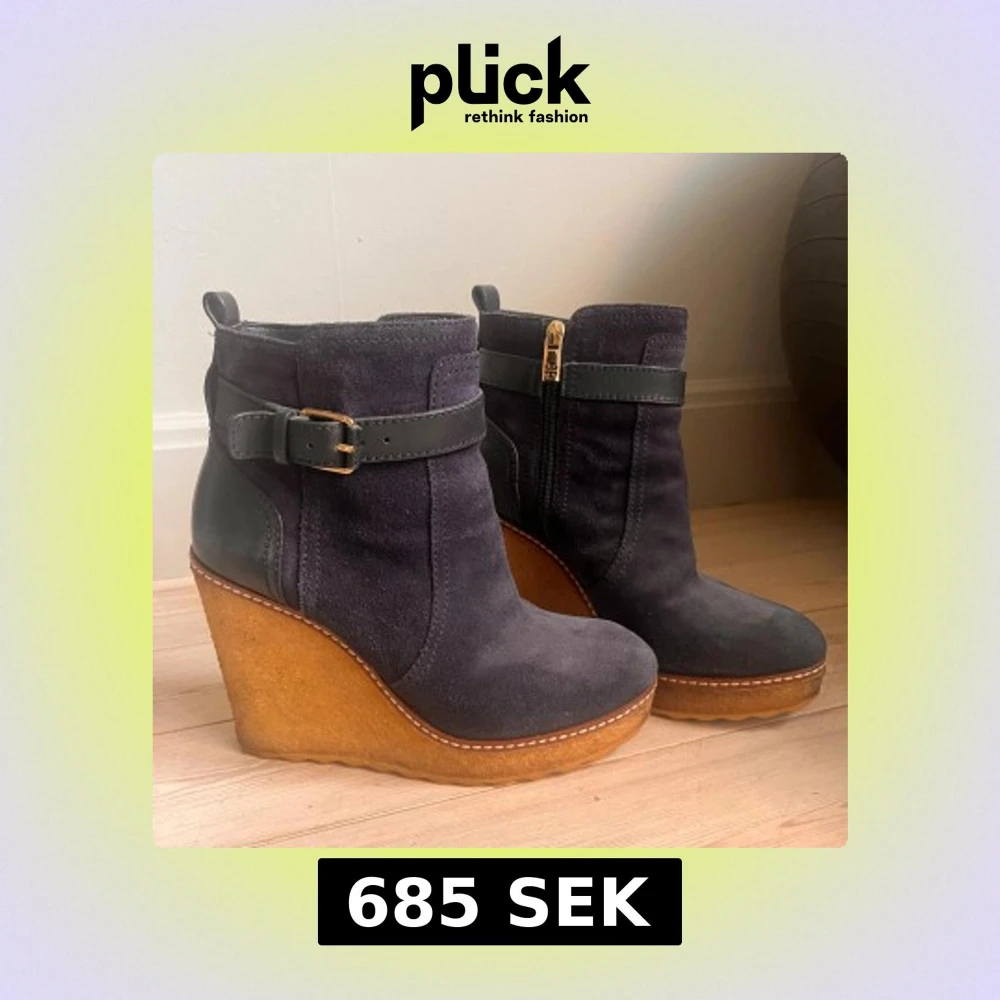 Snygga wedge boots från Tory Burch i mocka och skinn med guldfärgad dragkedja och spänne. Insidan är fodrad med mjuk päls för extra värme. Sulan är i gummi med tydlig logga undertill och bootsen har en hög kilklack som ger grym höjd. Fint skick inne och ute.