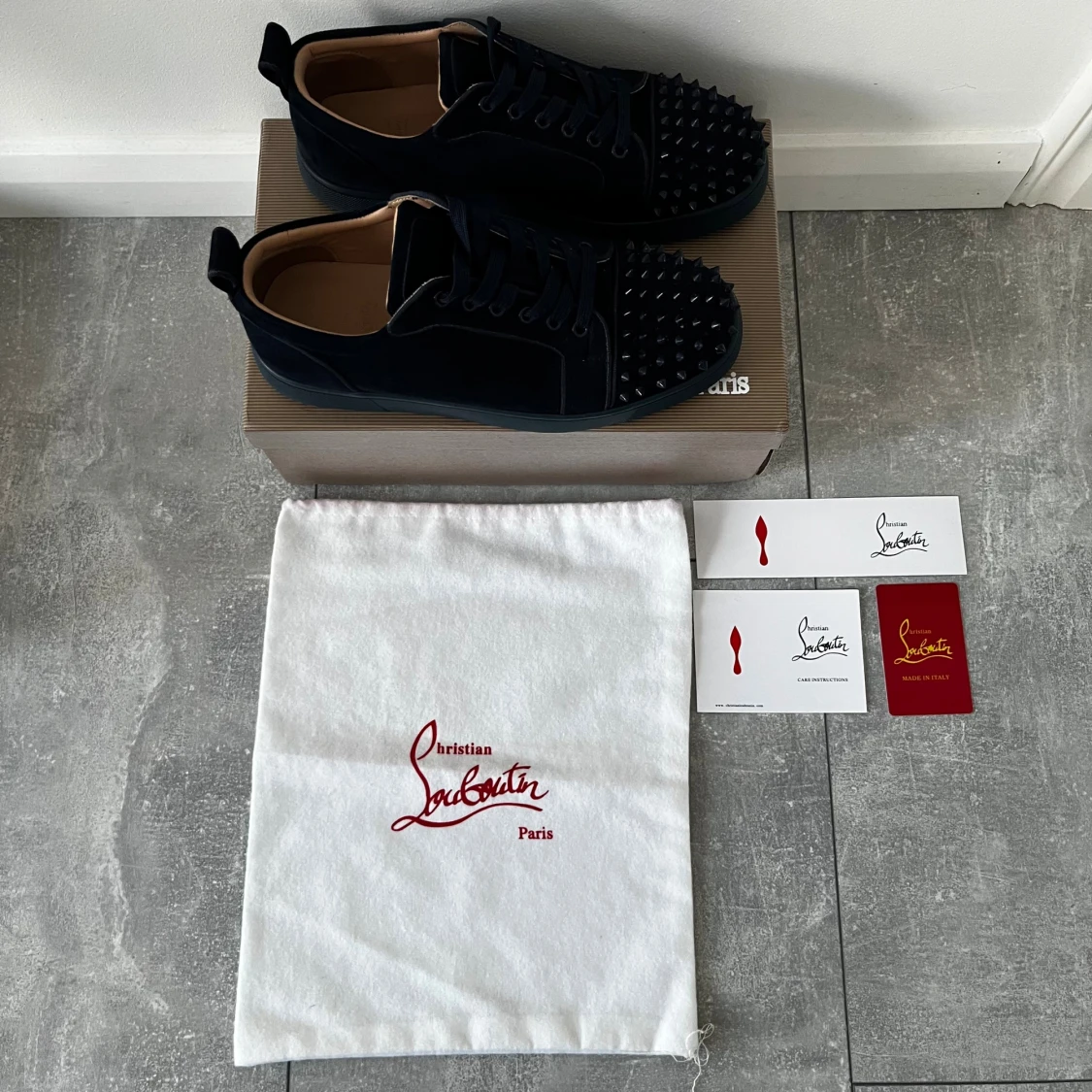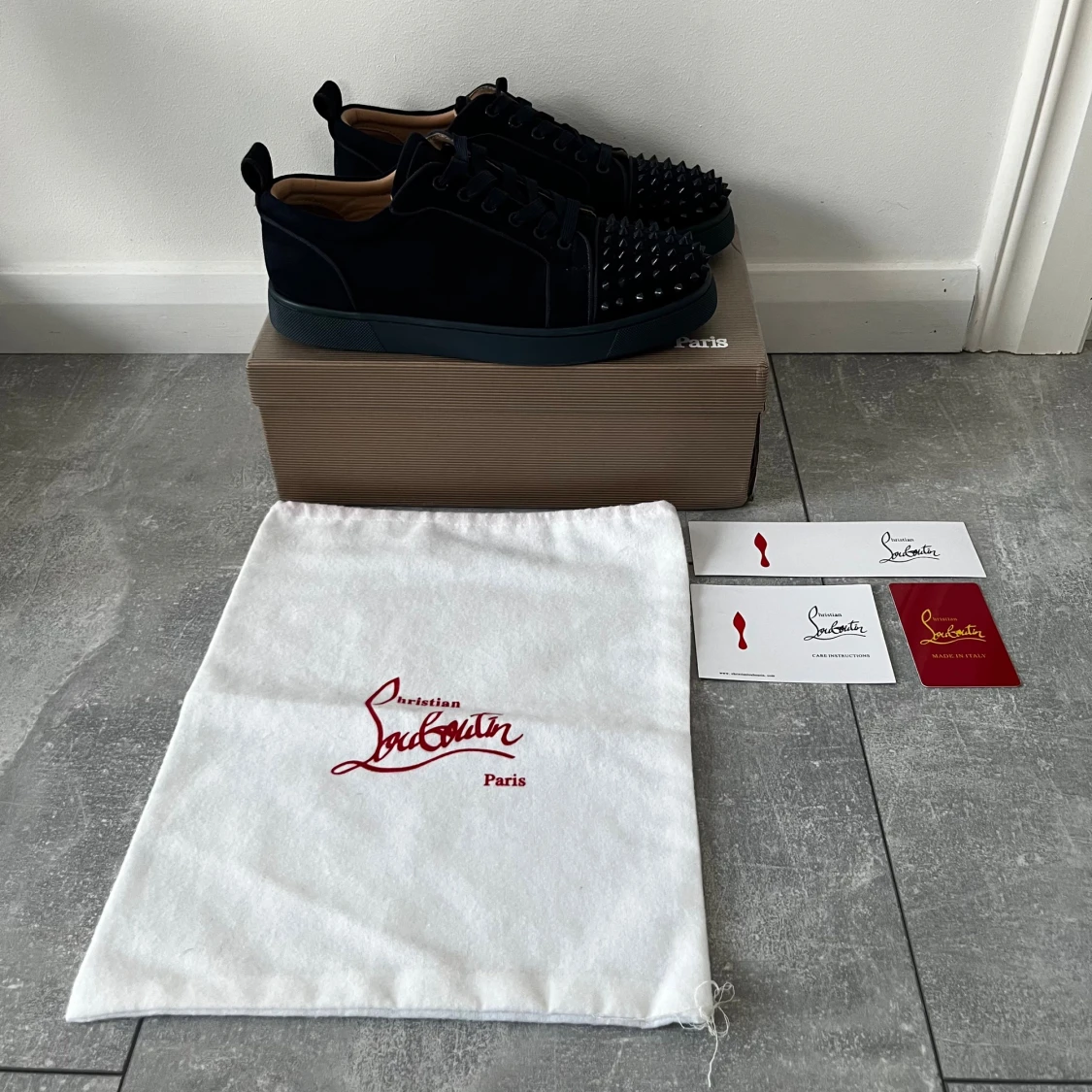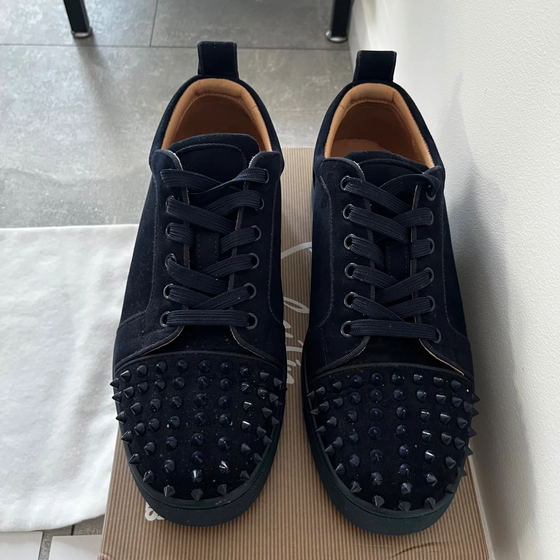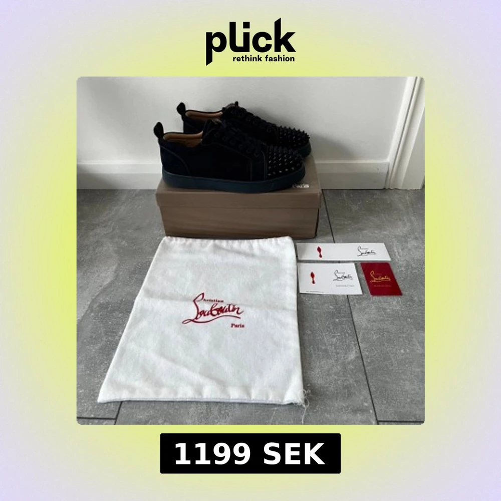 Säljer ett par marinblåa sneakers från Christian Louboutin med coola svarta nitar på tån. En nit har gått bort från ena skon men inget som syns så mycket alls. Skorna är i mocka och kommer med originalpåse och äkthetskort.