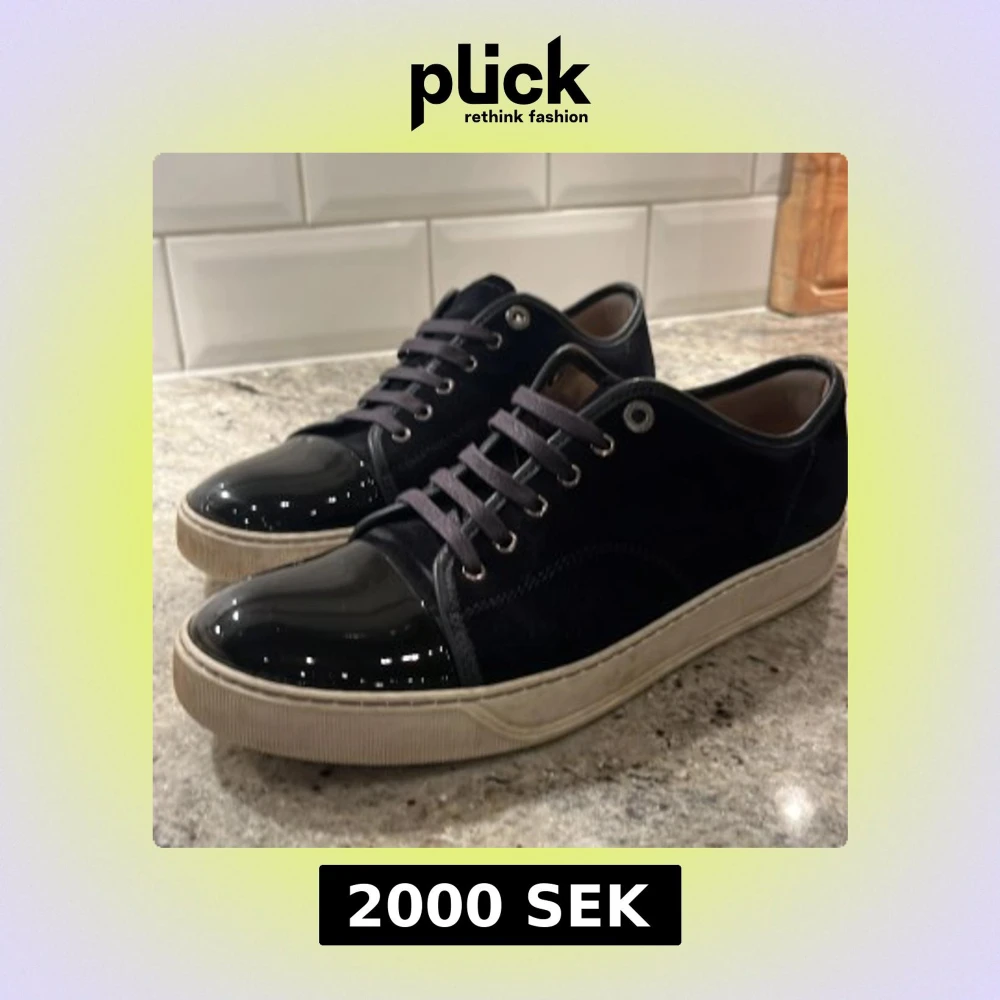 Snygga marinblåa sneakers från Lanvin med glansig tå och snörning. Skorna har en stilren design med en vit sula som ger en modern touch. Mochan är nästan helt ny inte särskilt använda. Har box och andra snören.