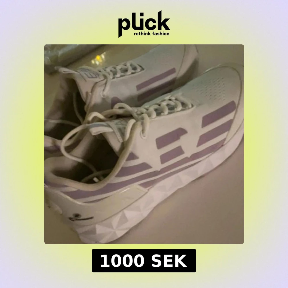 Säljer ett par snygga vita sneakers från EA7 med lila detaljer och geometriskt mönstrad sula. Skorna har klassisk snörning och är perfekta för dig som gillar sportig stil.