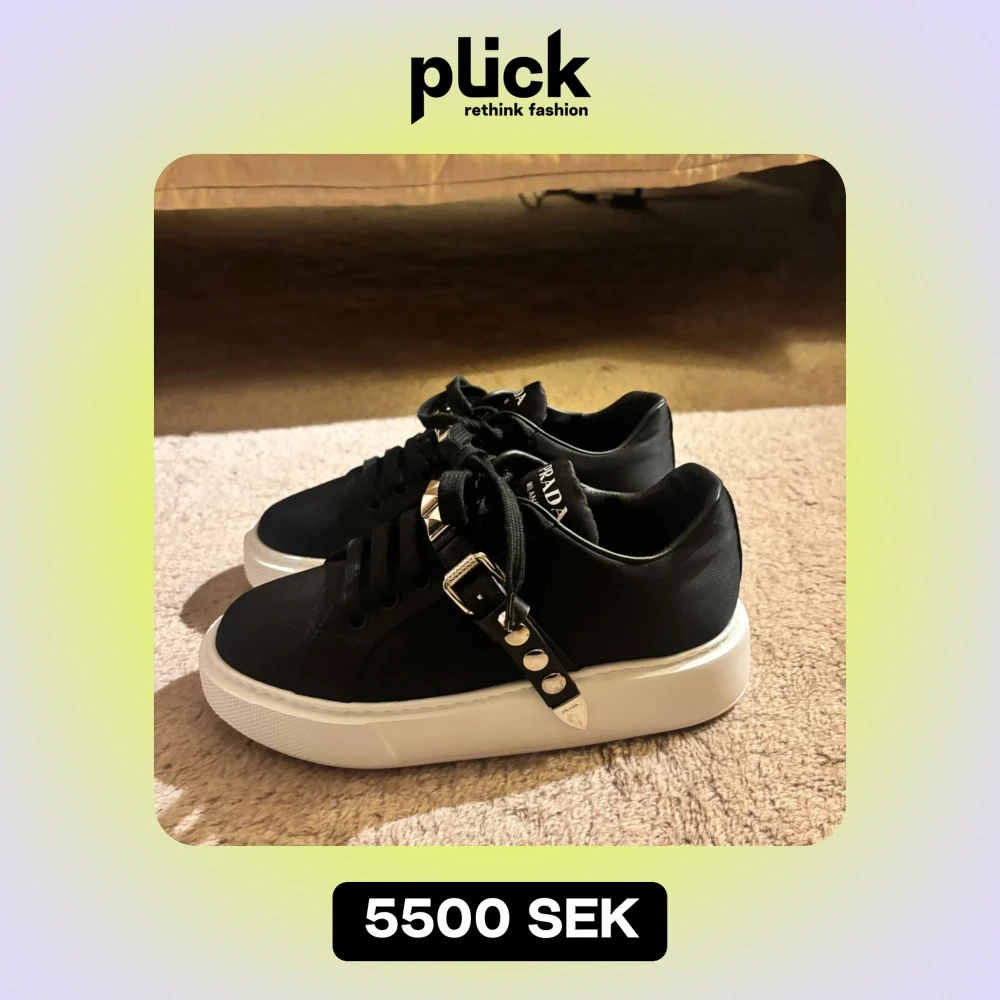 Helt oanvända!! Snygga svarta sneakers från Prada med en chunky vit sula. De har balla nitar och ett spänne som detalj på sidan. Skorna är i syntetmaterial och har snörning framtill. Perfekta för att ge din outfit det lilla extra!
