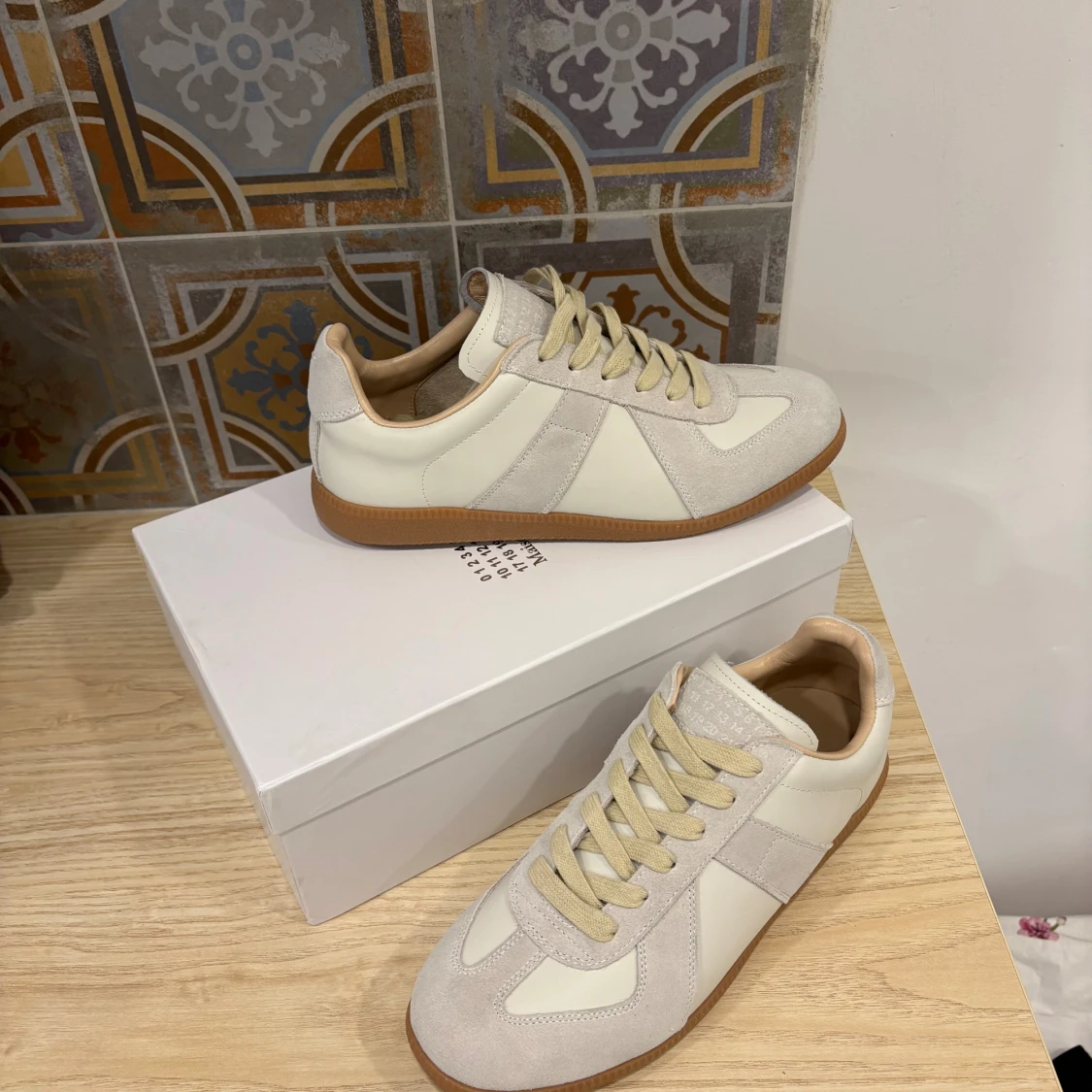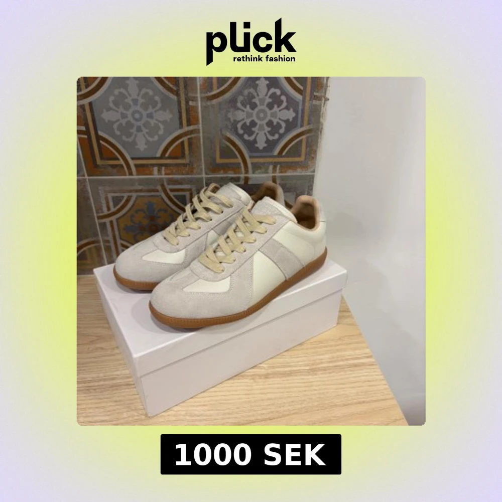 Snygga sneakers från Maison Margiela i beige och vitt med ovandel i mocka och skinn. Använda några gånger