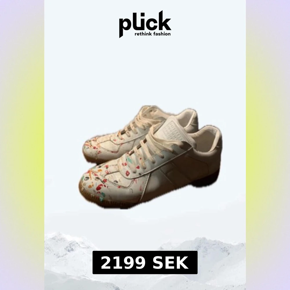 Maison Margiela sneakers i vitt skinn med coola färgstänk i rött, blått, orange och svart på tån och sidorna. Klassisk låg modell med snörning och gummisula. Tillverkade i lamm- och kalvskinn, med en unik konstnärlig vibe som sticker ut.