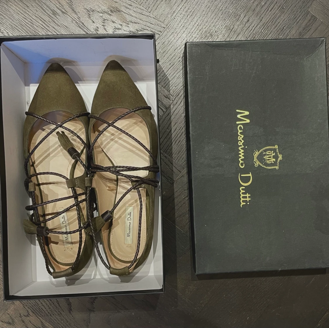 Gröna khaki ballerinas med snörning i mocka. Använda cirka 3 gånger. Stl 38. Från Massimo dutti. Nypris 999:-
