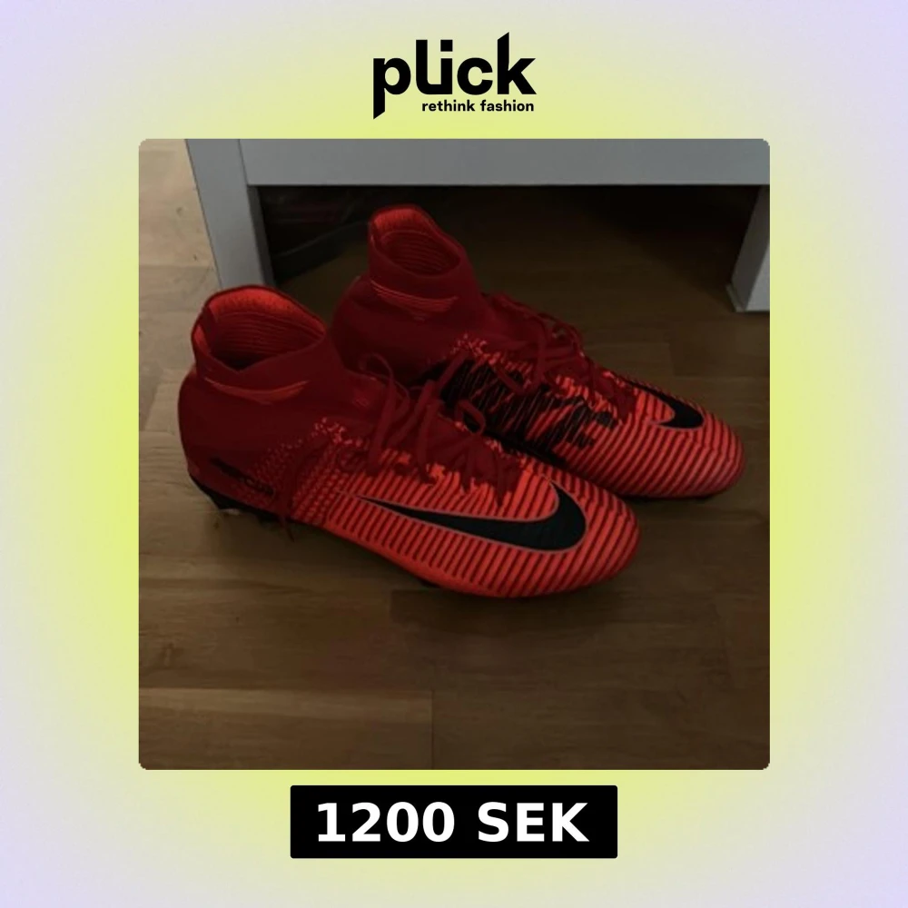 Säljer ett par riktigt snygga röda Nike fotbollsskor med svarta detaljer och coolt randigt mönster. Skorna har högre skaft för extra stöd, snörning och plös med Nike-logga. Perfekta för dig som vill sticka ut på planen. Vid fundering hör av dig// William
